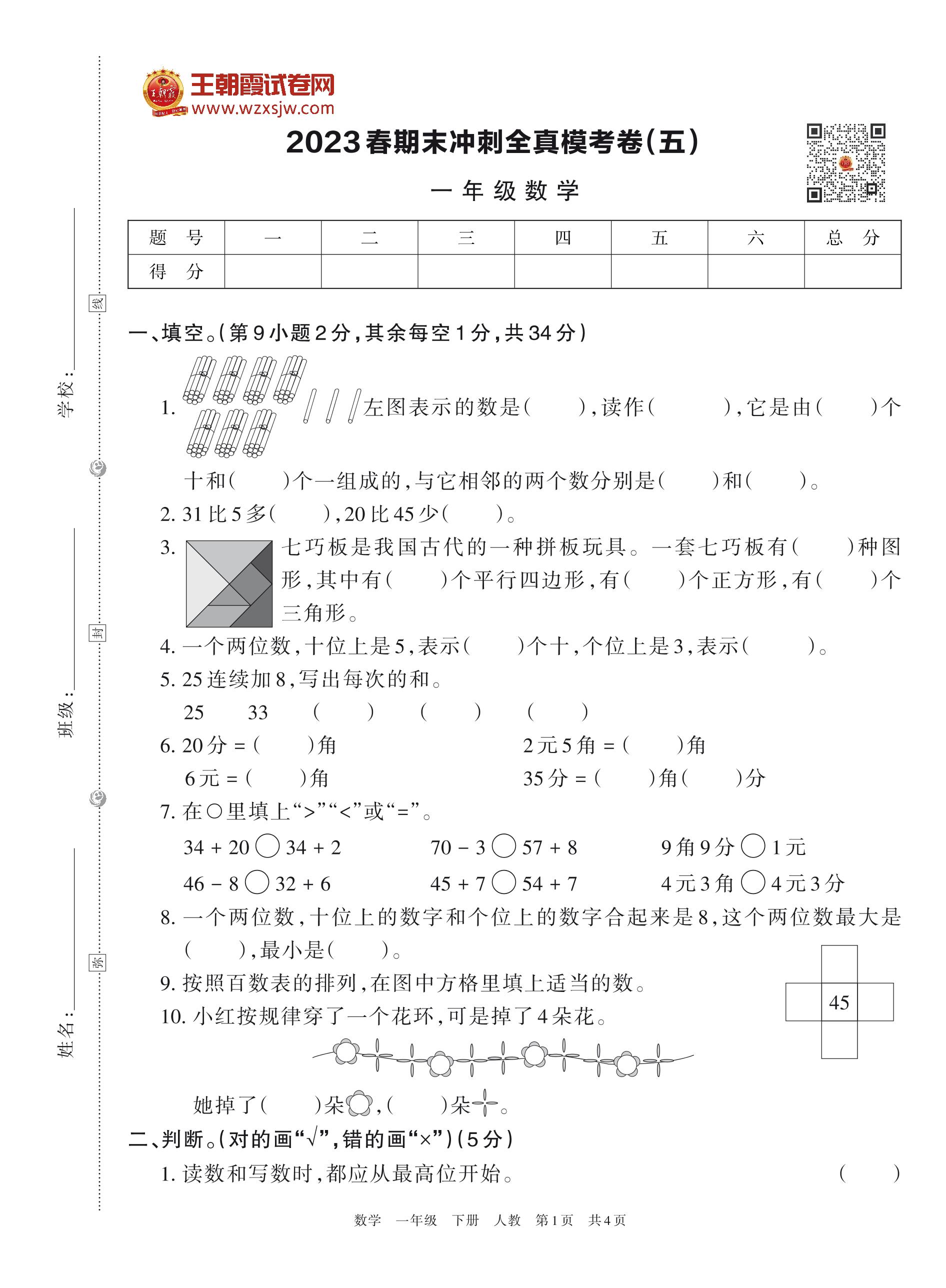 2023春期末冲刺全真模考卷(五)一年级数学(人教版)