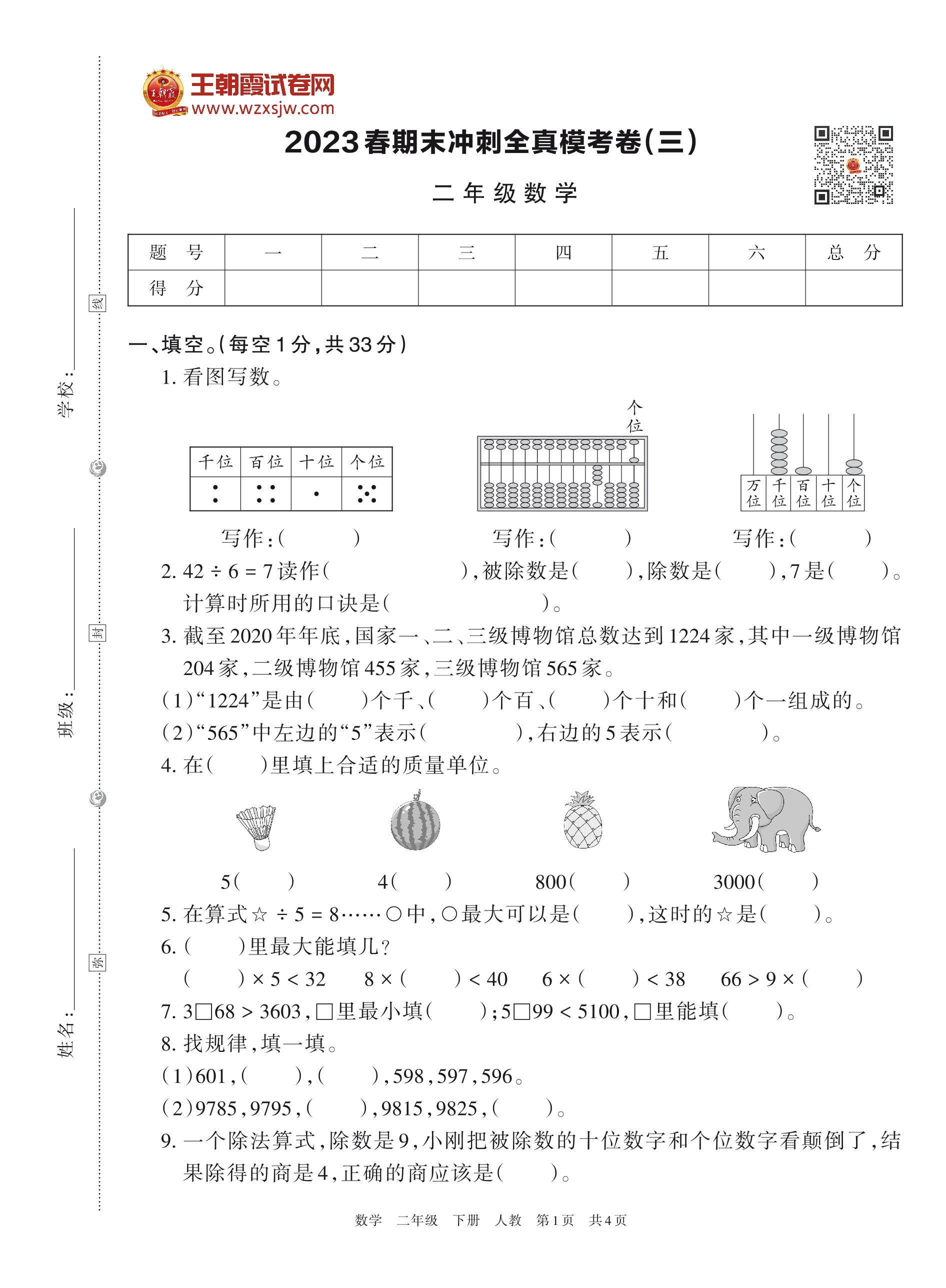 2023春期末冲刺全真模考卷(三)二年级数学(人教版)