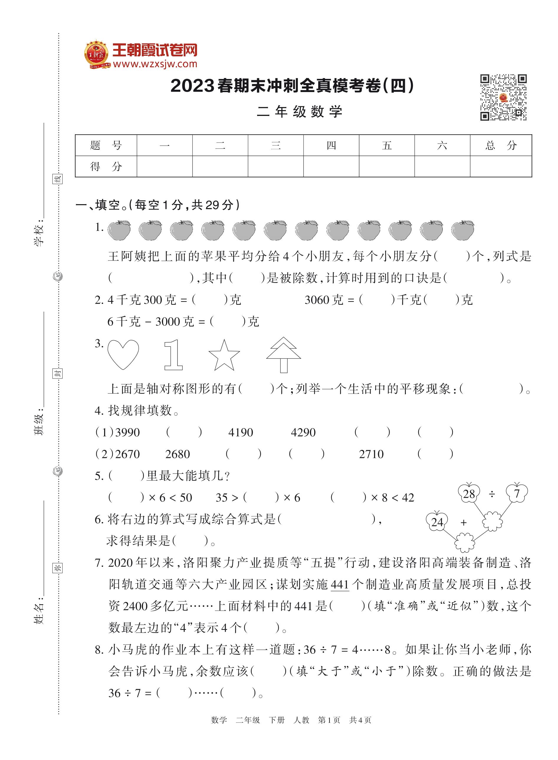 2023春期末冲刺全真模考卷(四)二年级数学(人教版)