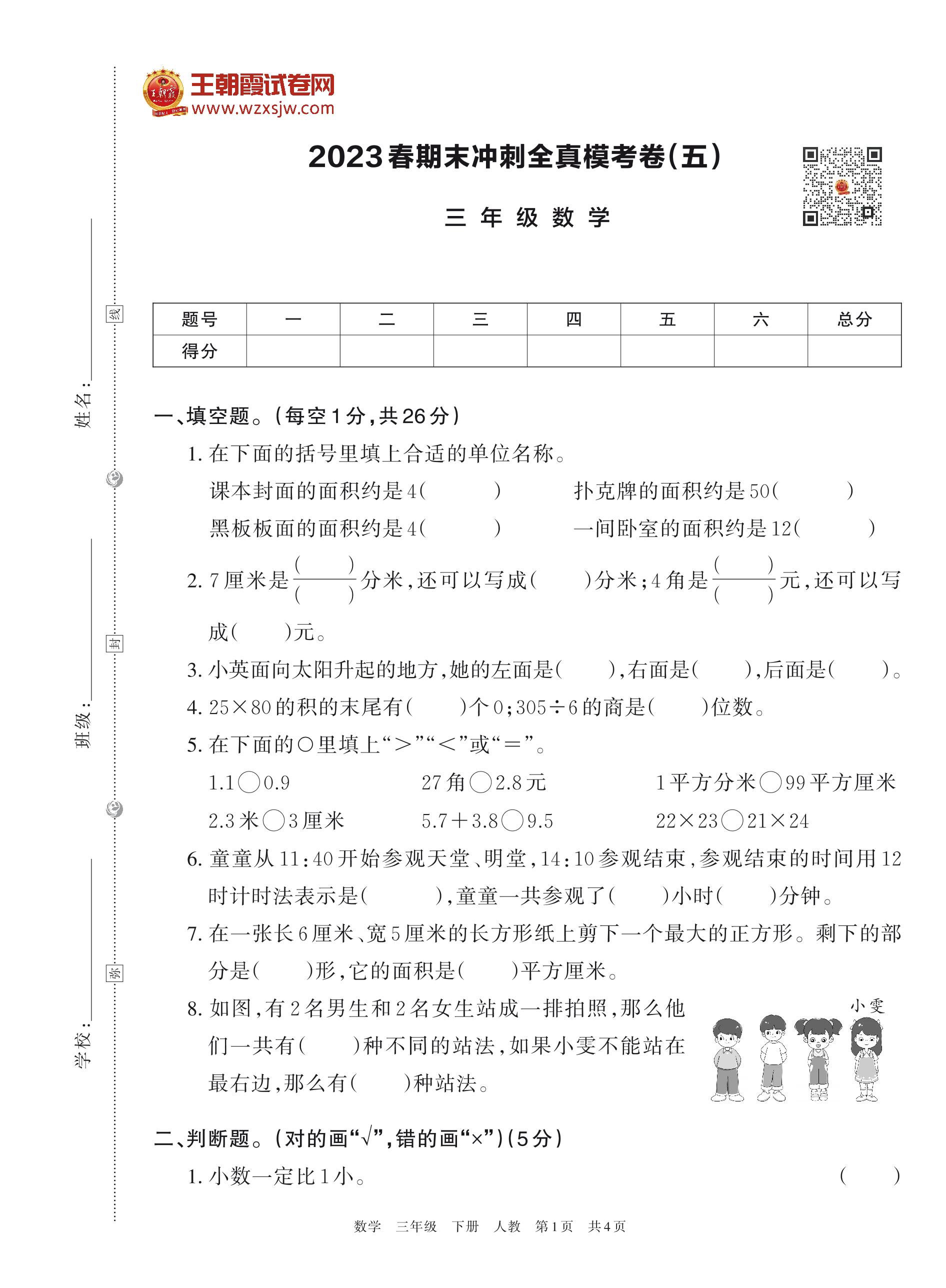 2023春期末冲刺全真模考卷(五)三年级数学(人教版)