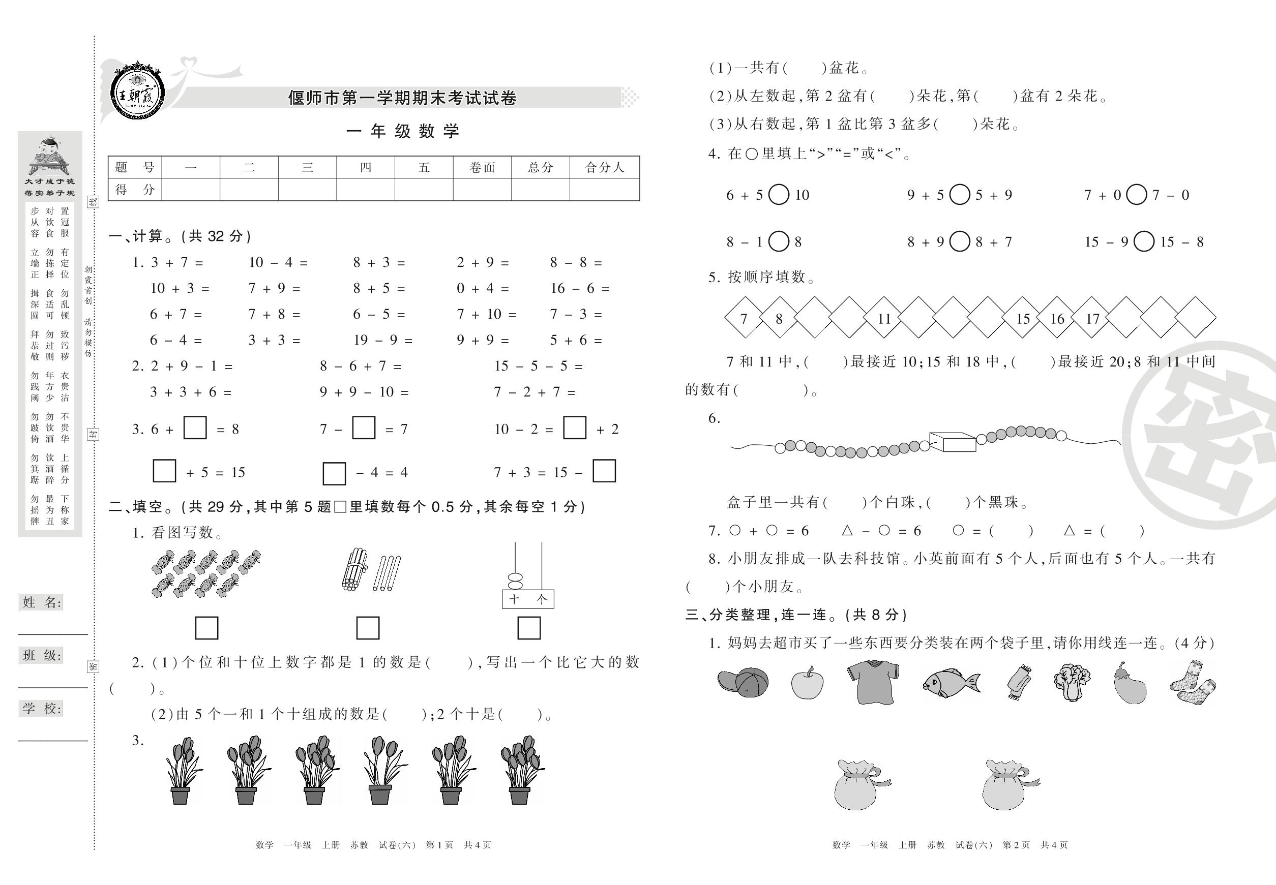 一年级数学苏教版上册期末卷