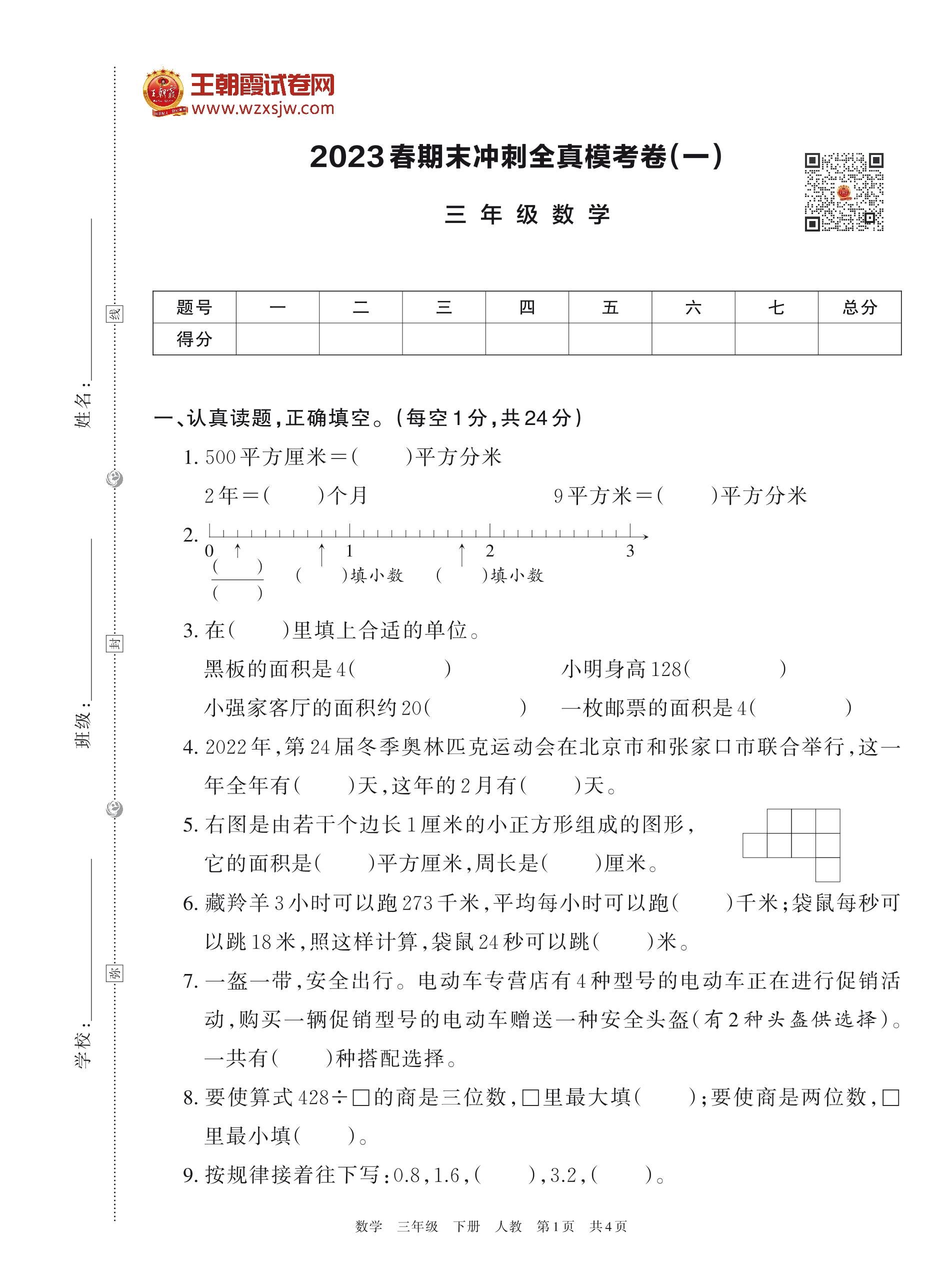 2023春期末冲刺全真模考卷(一)三年级数学(人教版)