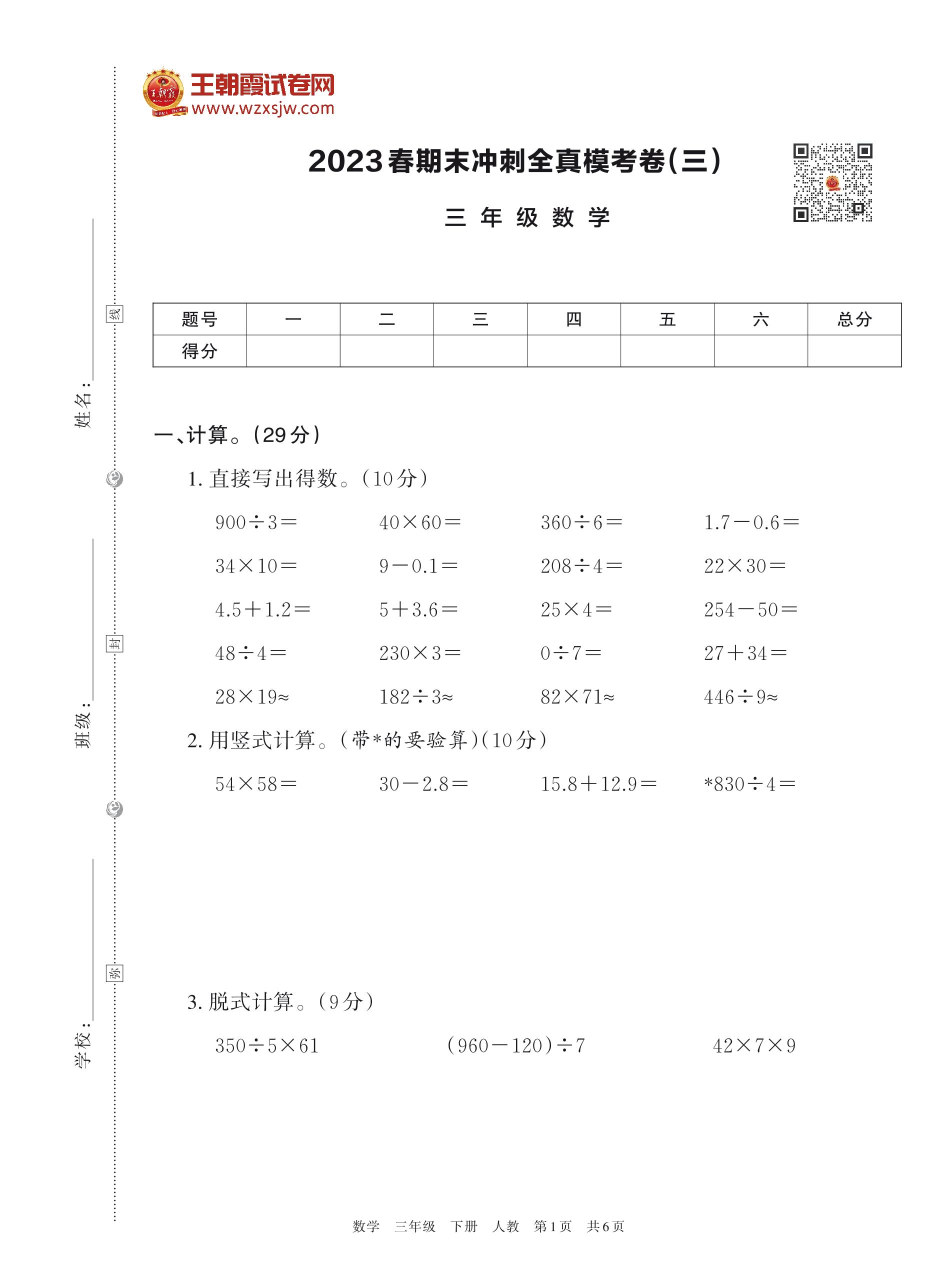 2023春期末冲刺全真模考卷(三)三年级数学(人教版)