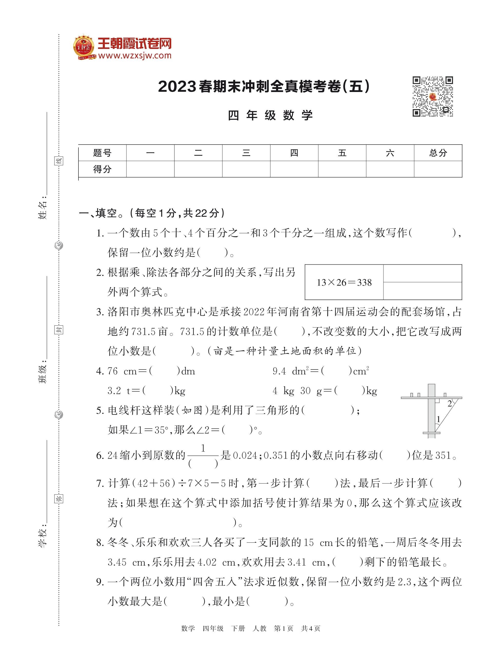 2023春期末冲刺全真模考卷(五)四年级数学(人教版)