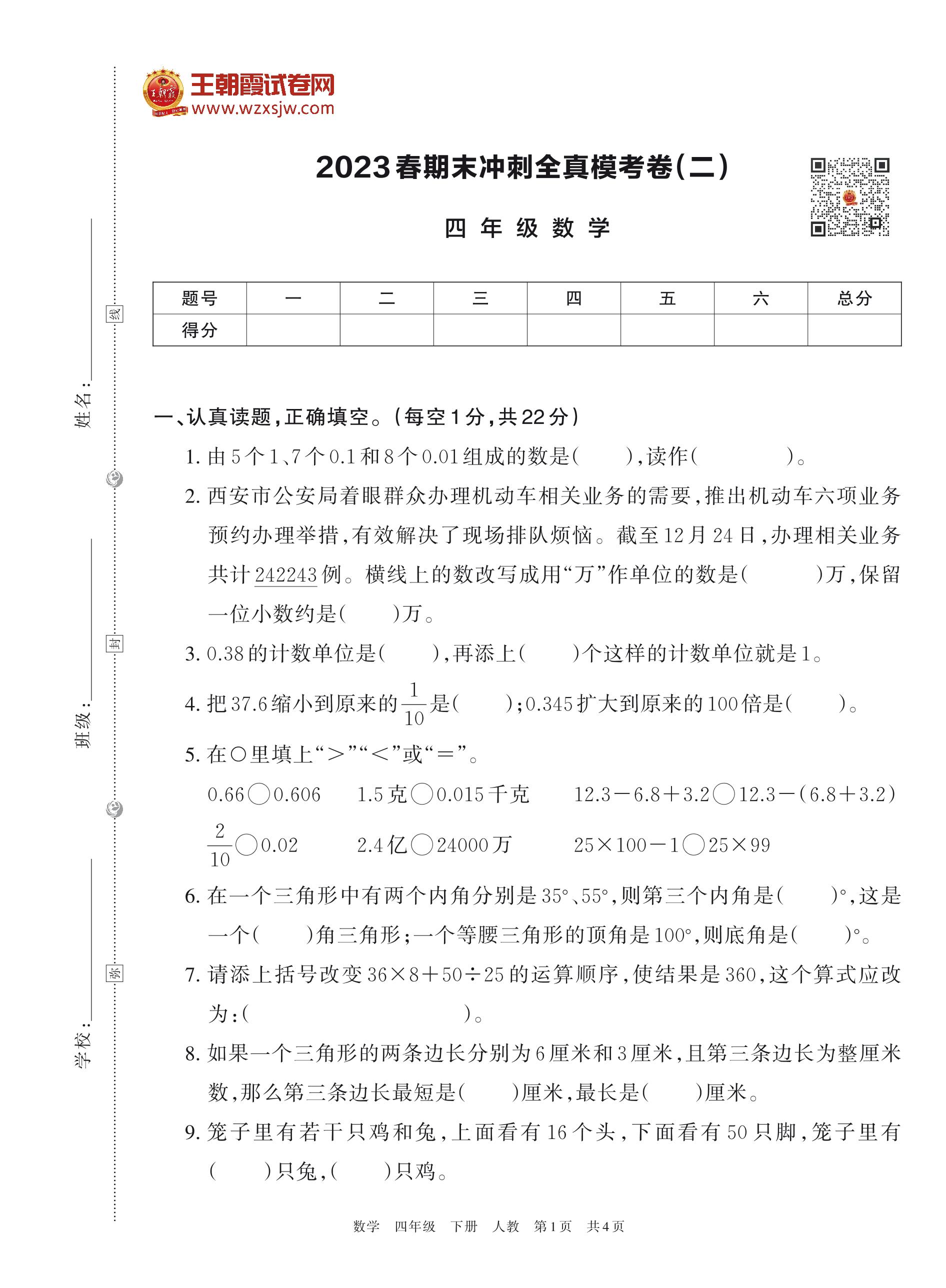 2023春期末冲刺全真模考卷(二)四年级数学(人教版)