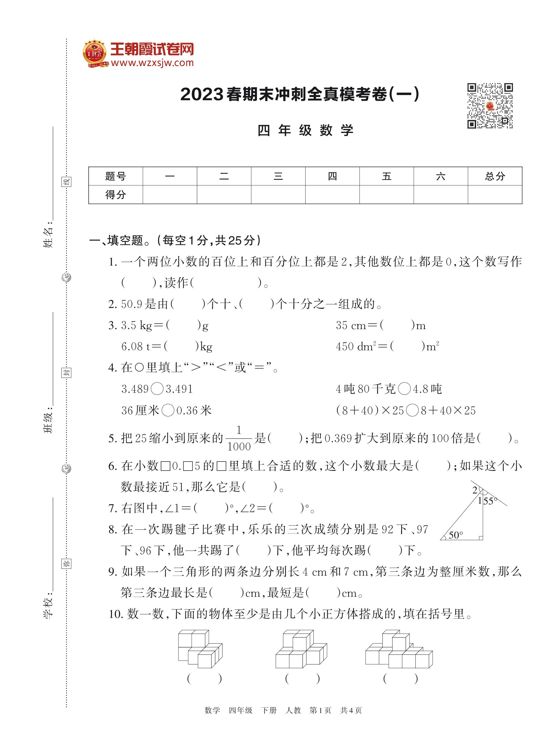 2023春期末冲刺全真模考卷(一)四年级数学(人教版)
