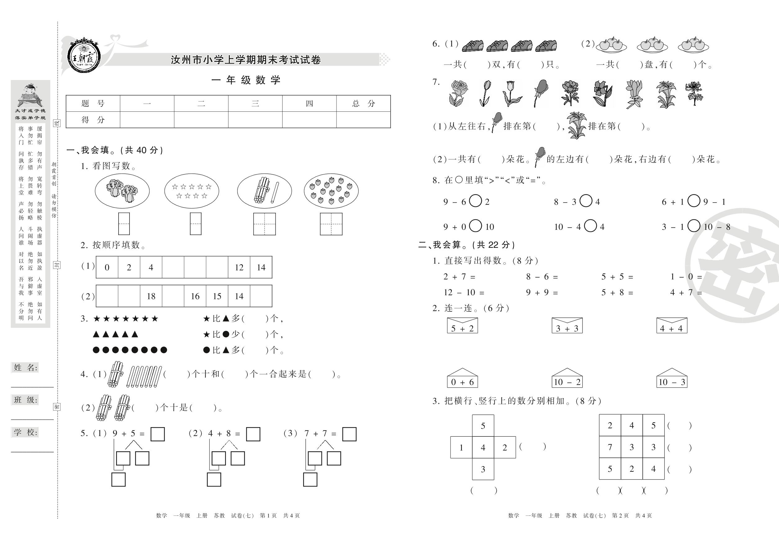 2016-2017学年第一学期汝州市一年级数学试卷(苏教版)【7】