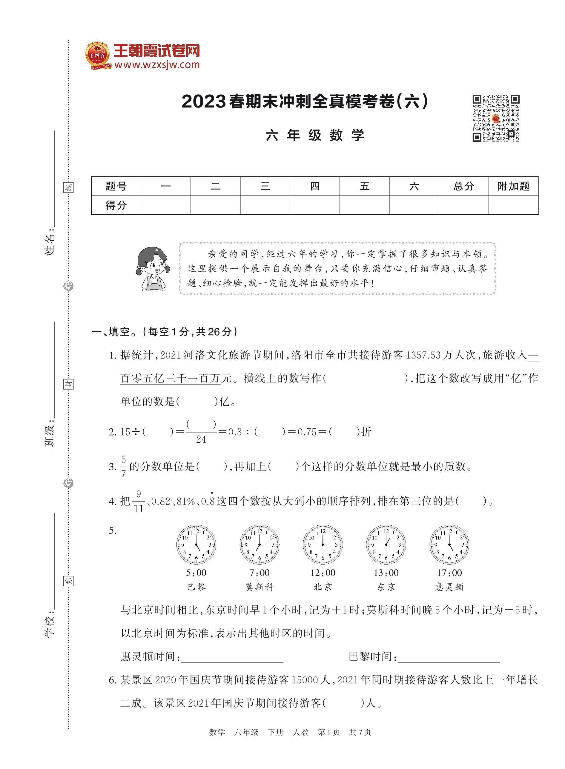 2023春期末冲刺全真模考卷(六)六年级数学(人教版)