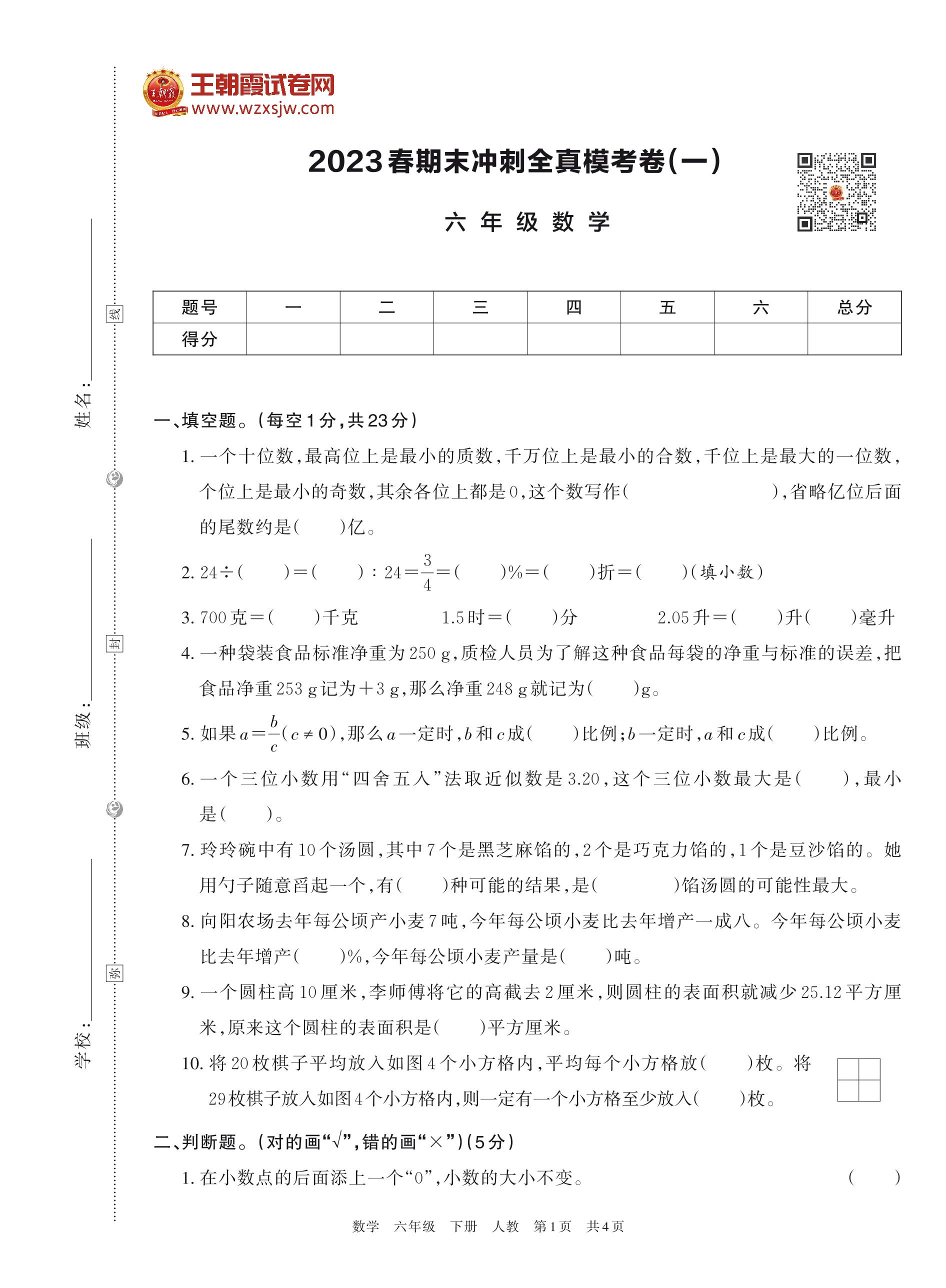 2023春期末冲刺全真模考卷(一)六年级数学(人教版)