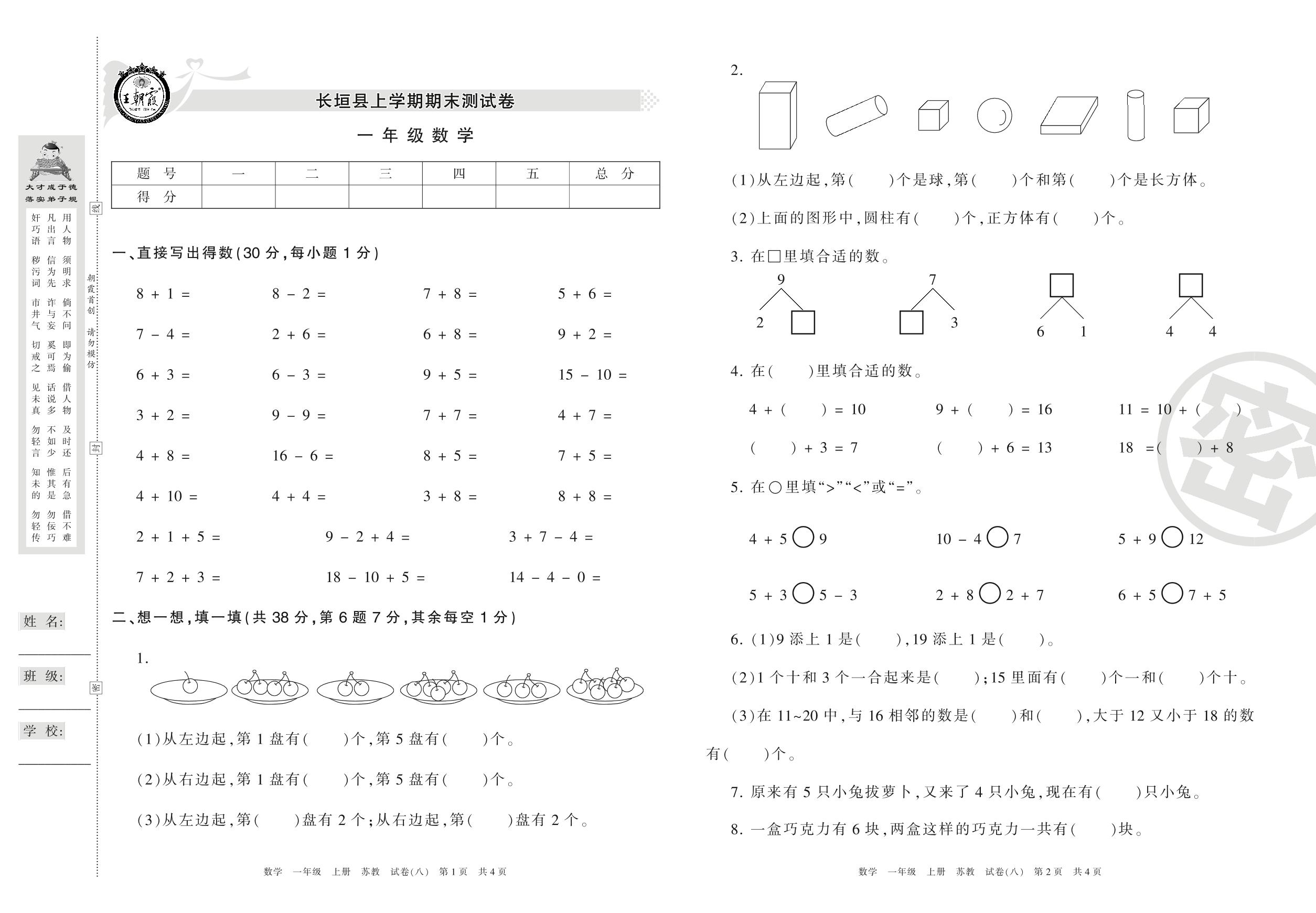 2016-2017学年第一学期新乡市长垣县一年级数学试卷(苏教版)【8】