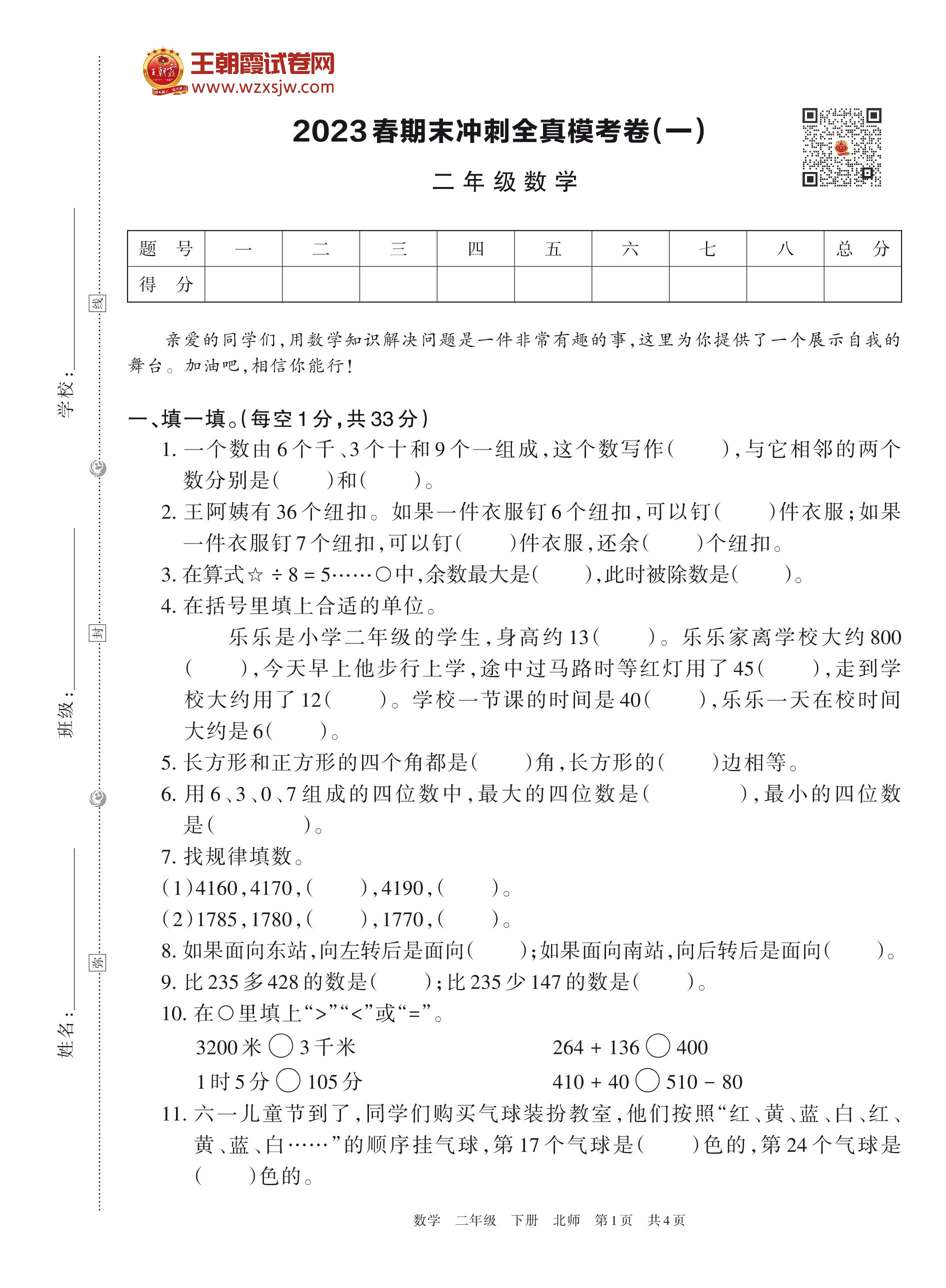 2023春期末冲刺全真模考卷(一)二年级数学(北师版)