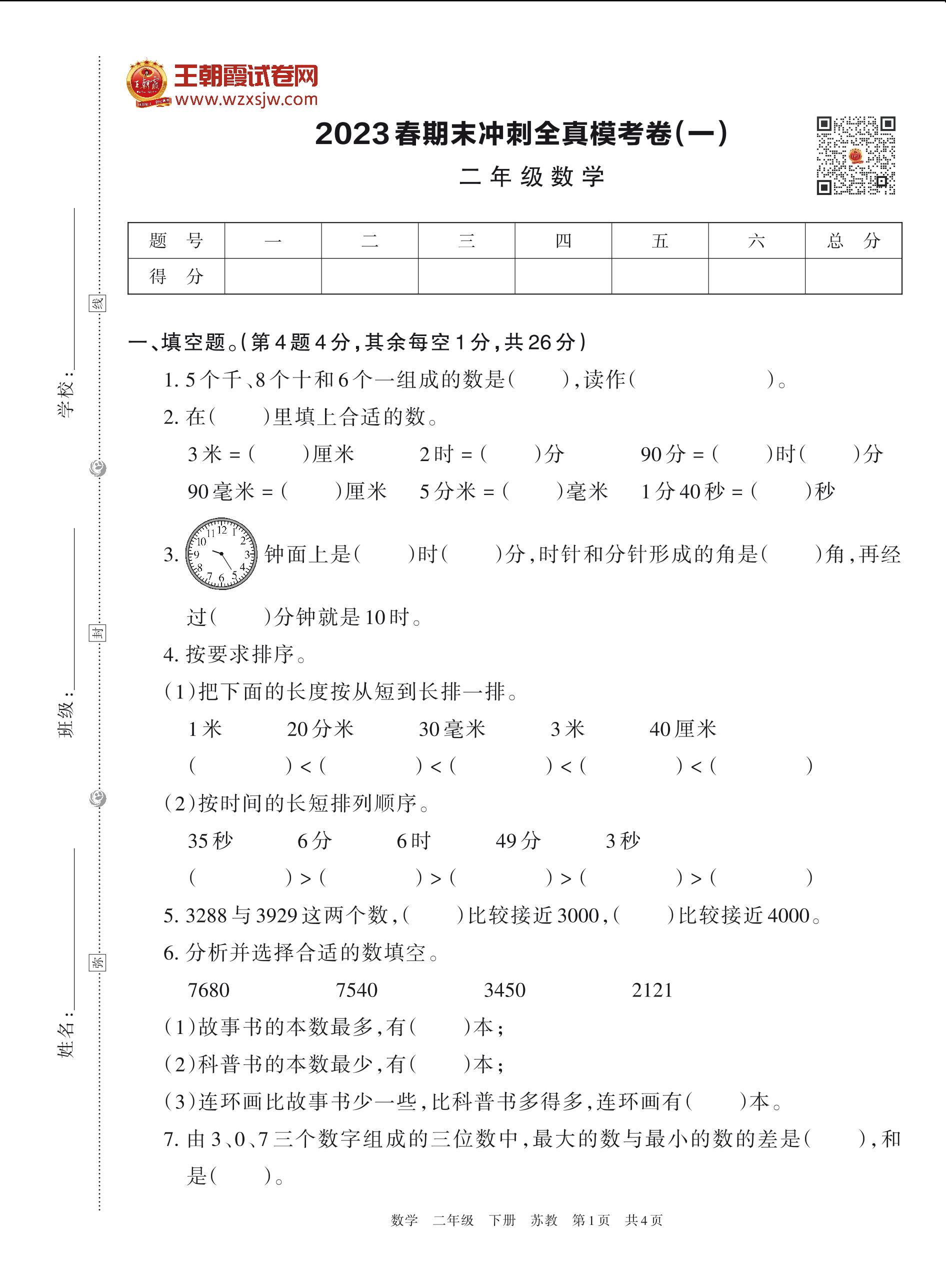 2023春期末冲刺全真模考卷(一)二年级数学(苏教版)