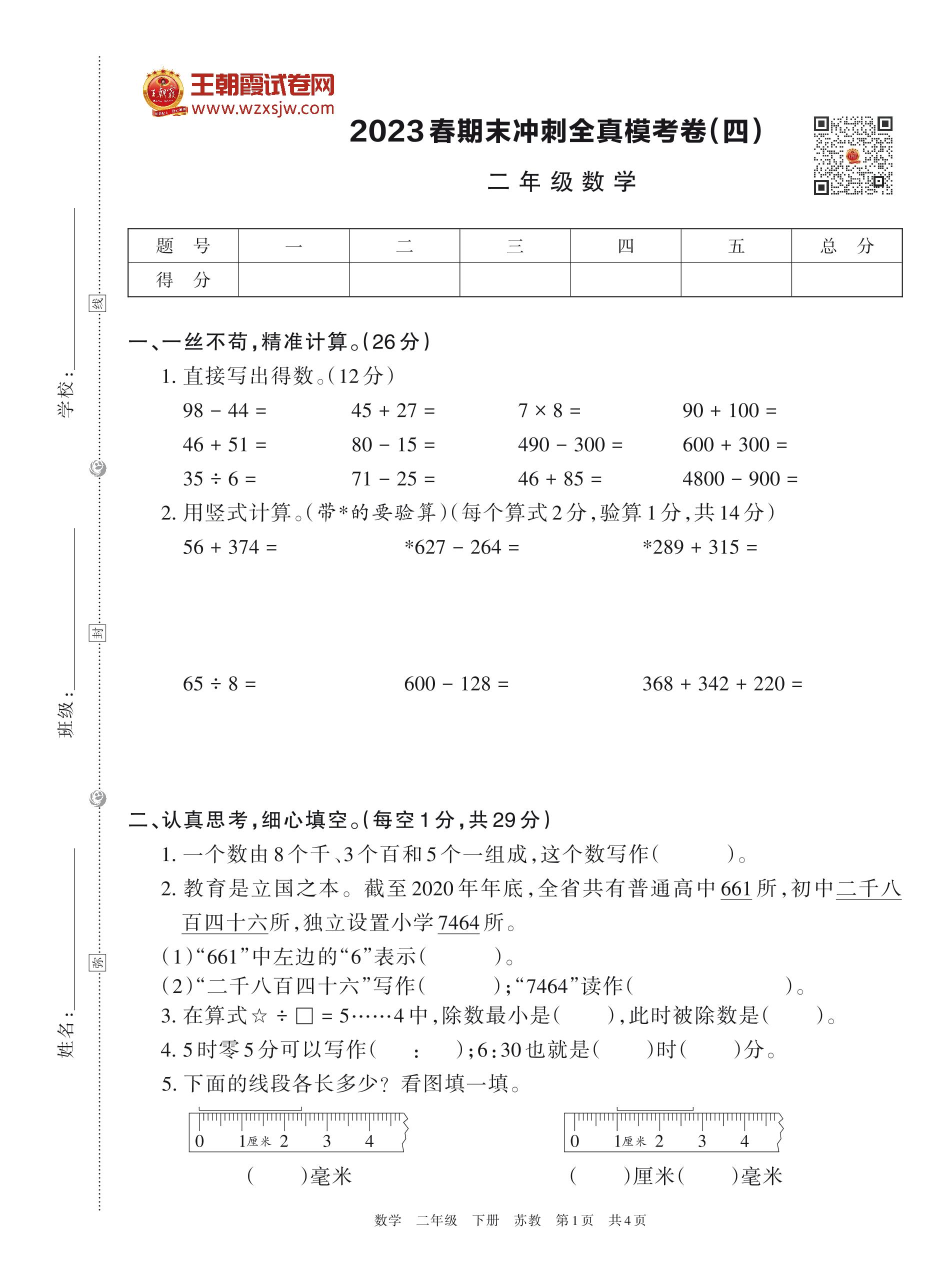 2023春期末冲刺全真模考卷(四)二年级数学(苏教版)