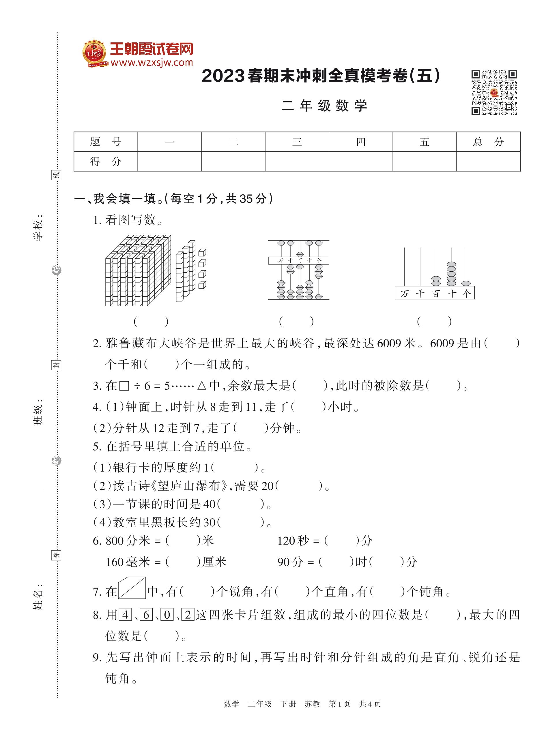 2023春期末冲刺全真模考卷(五)二年级数学(苏教版)