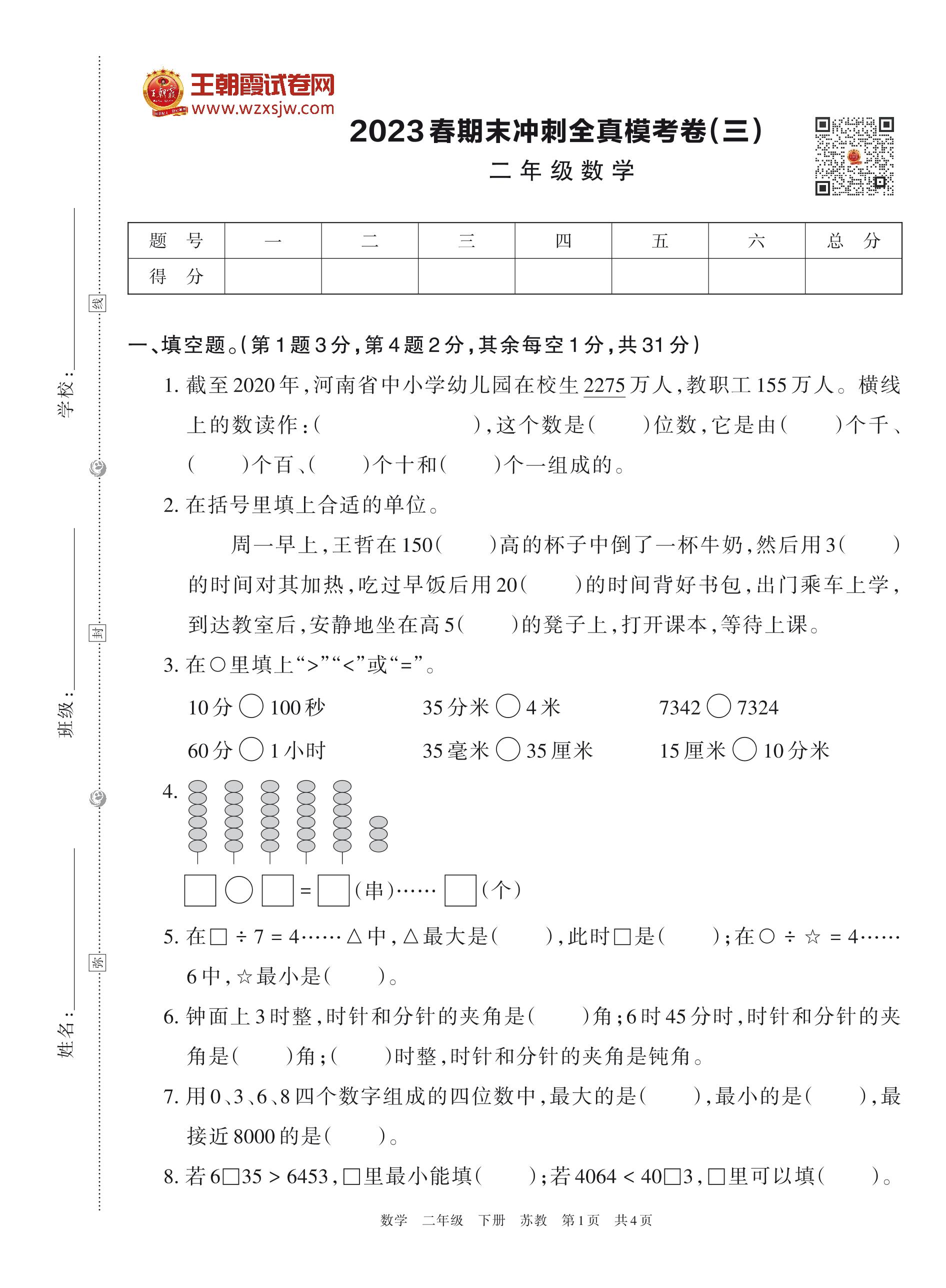 2023春期末冲刺全真模考卷(三)二年级数学(苏教版)