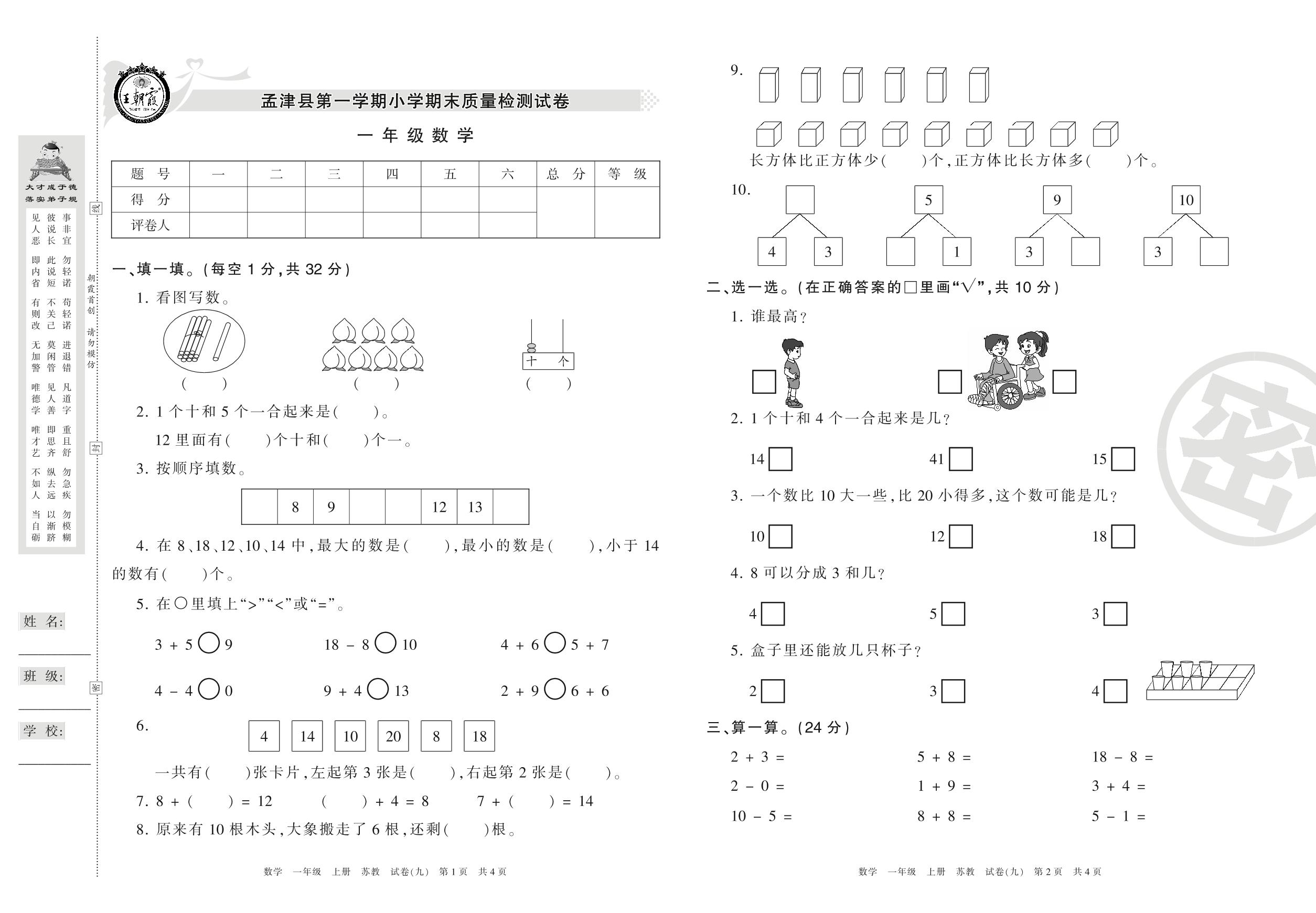 2016-2017学年第一学期洛阳市孟津县一年级数学试卷(苏教版)【9】