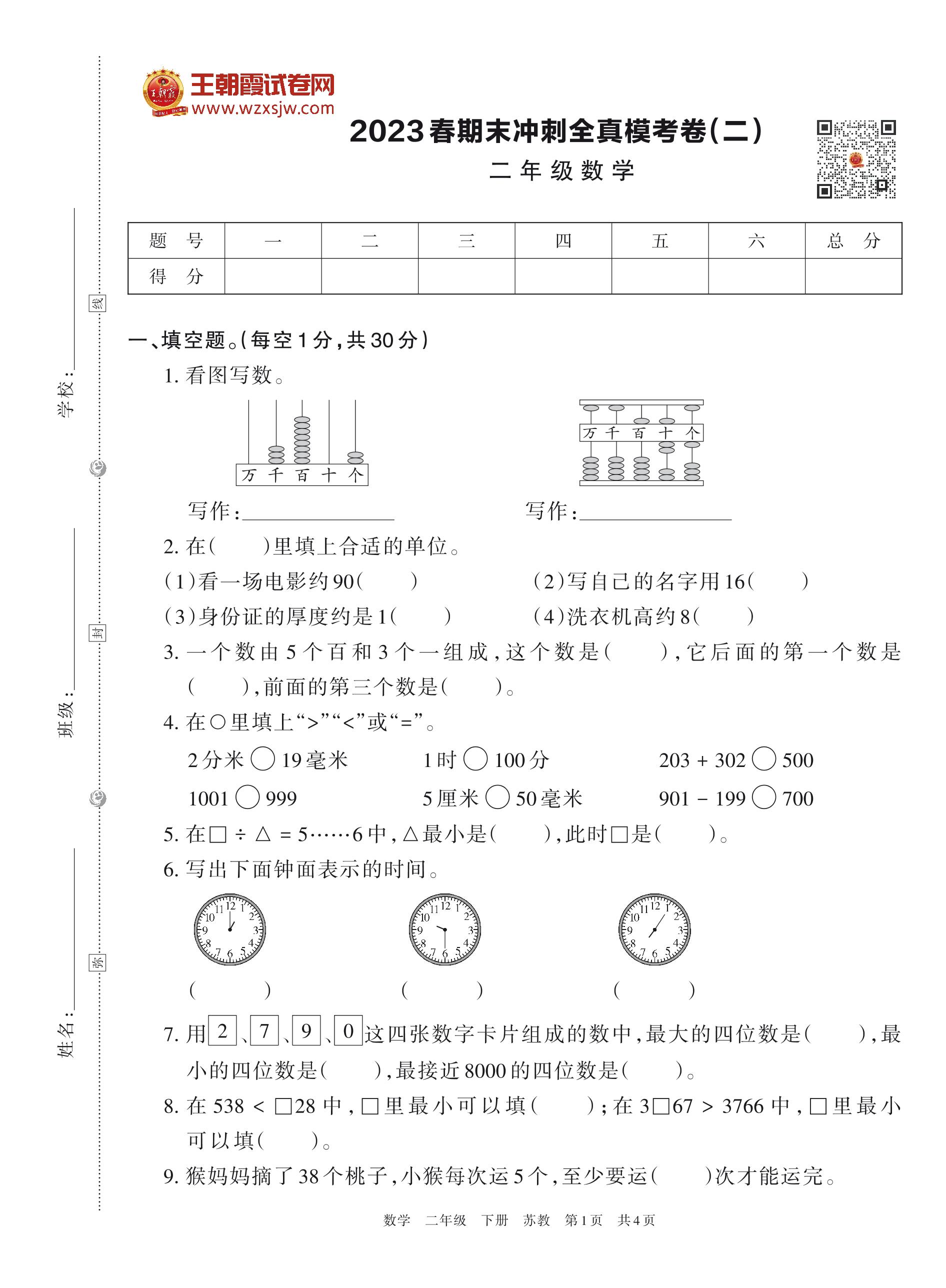 2023春期末冲刺全真模考卷(二)二年级数学(苏教版)