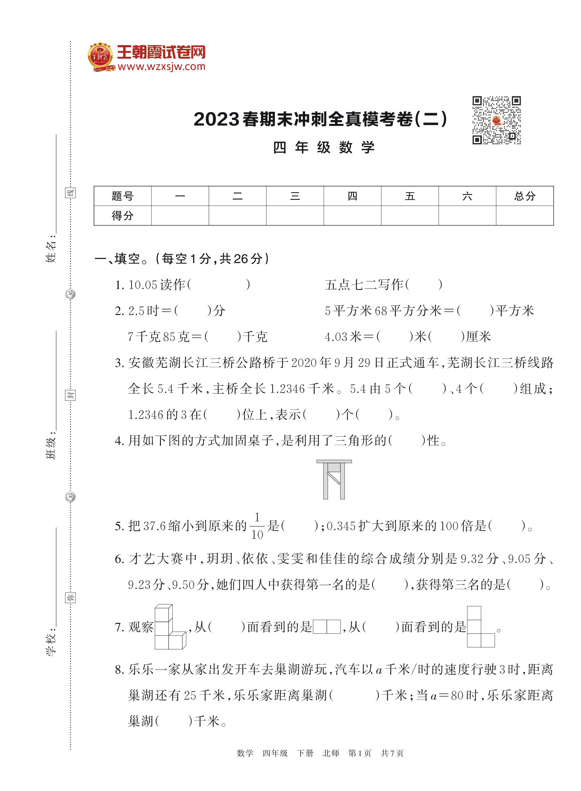 2023春期末冲刺全真模考卷(二)四年级数学(北师版)