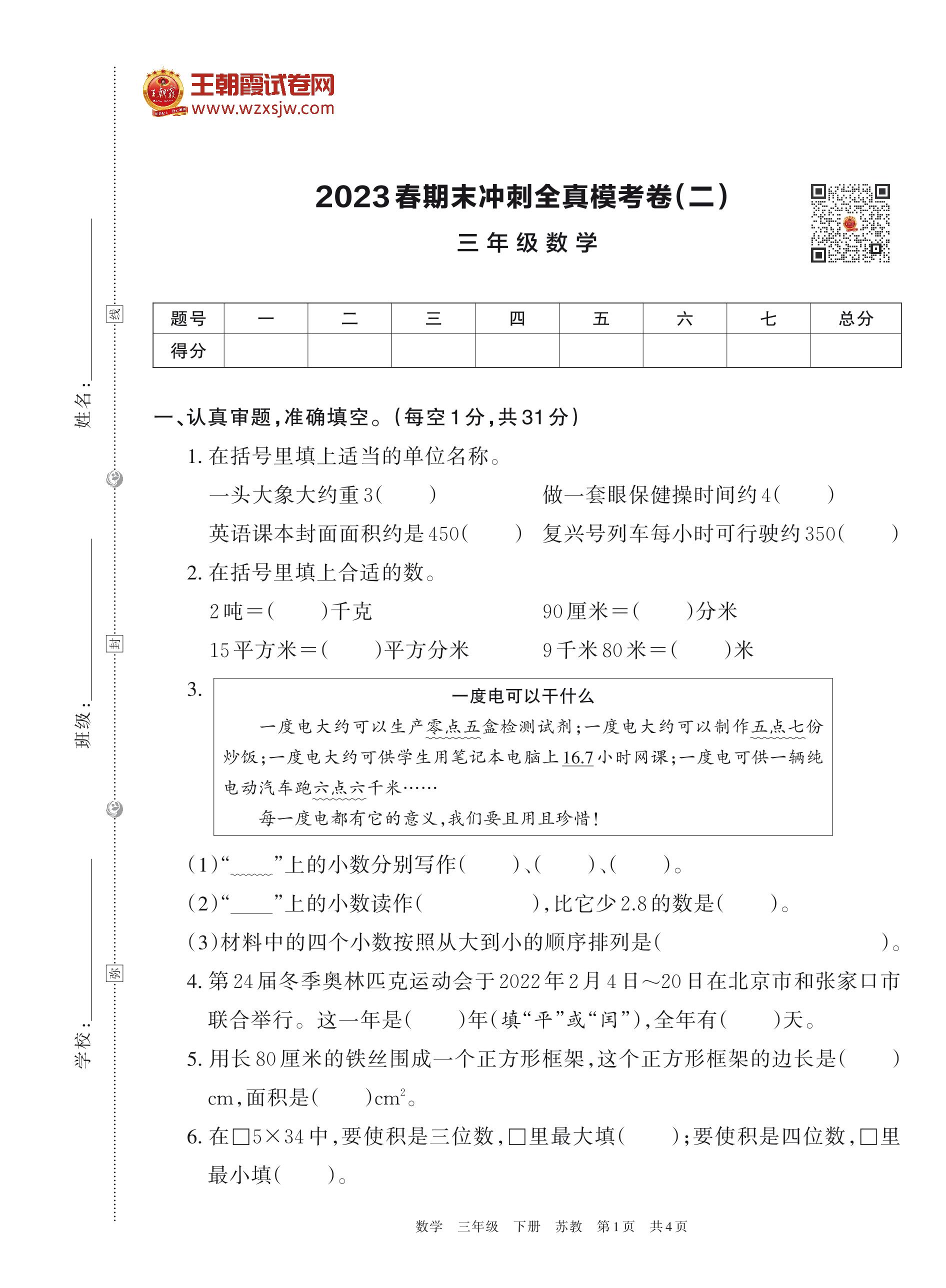 2023春期末冲刺全真模考卷(二)三年级数学(苏教版)