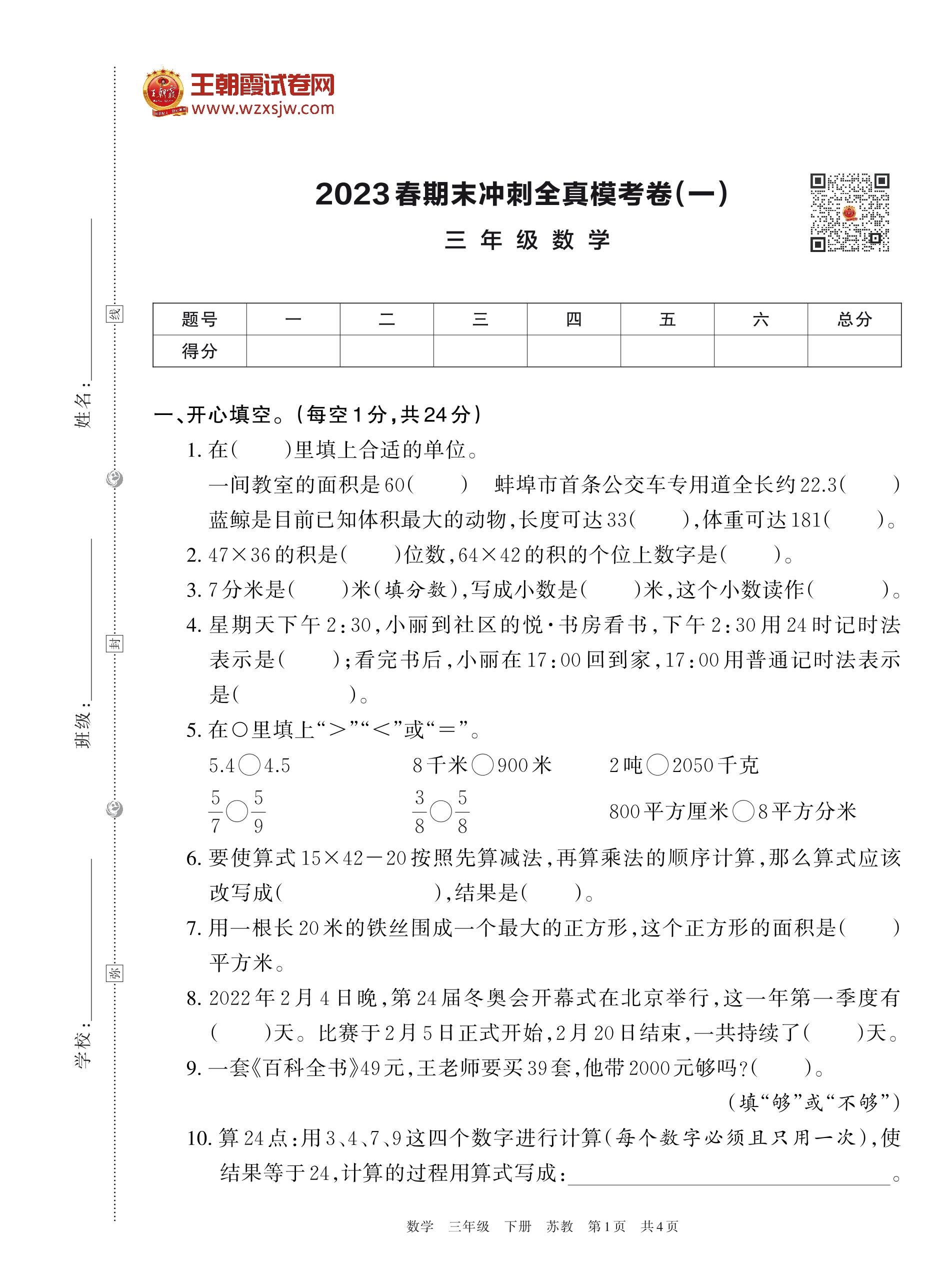 2023春期末冲刺全真模考卷(一)三年级数学(苏教版)