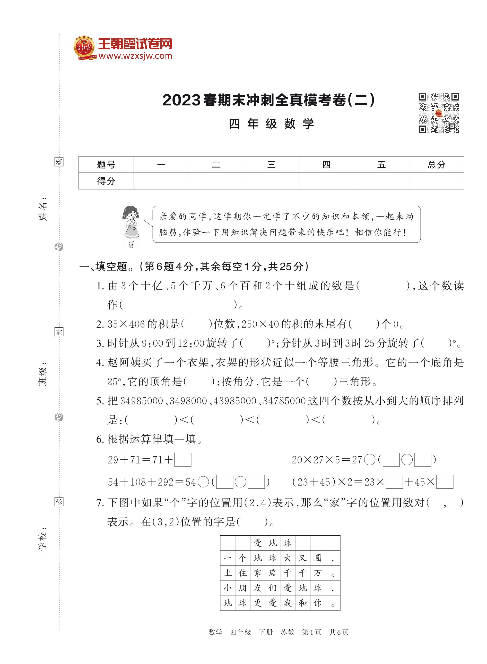 2023春期末冲刺全真模考卷(二)四年级数学(苏教版)