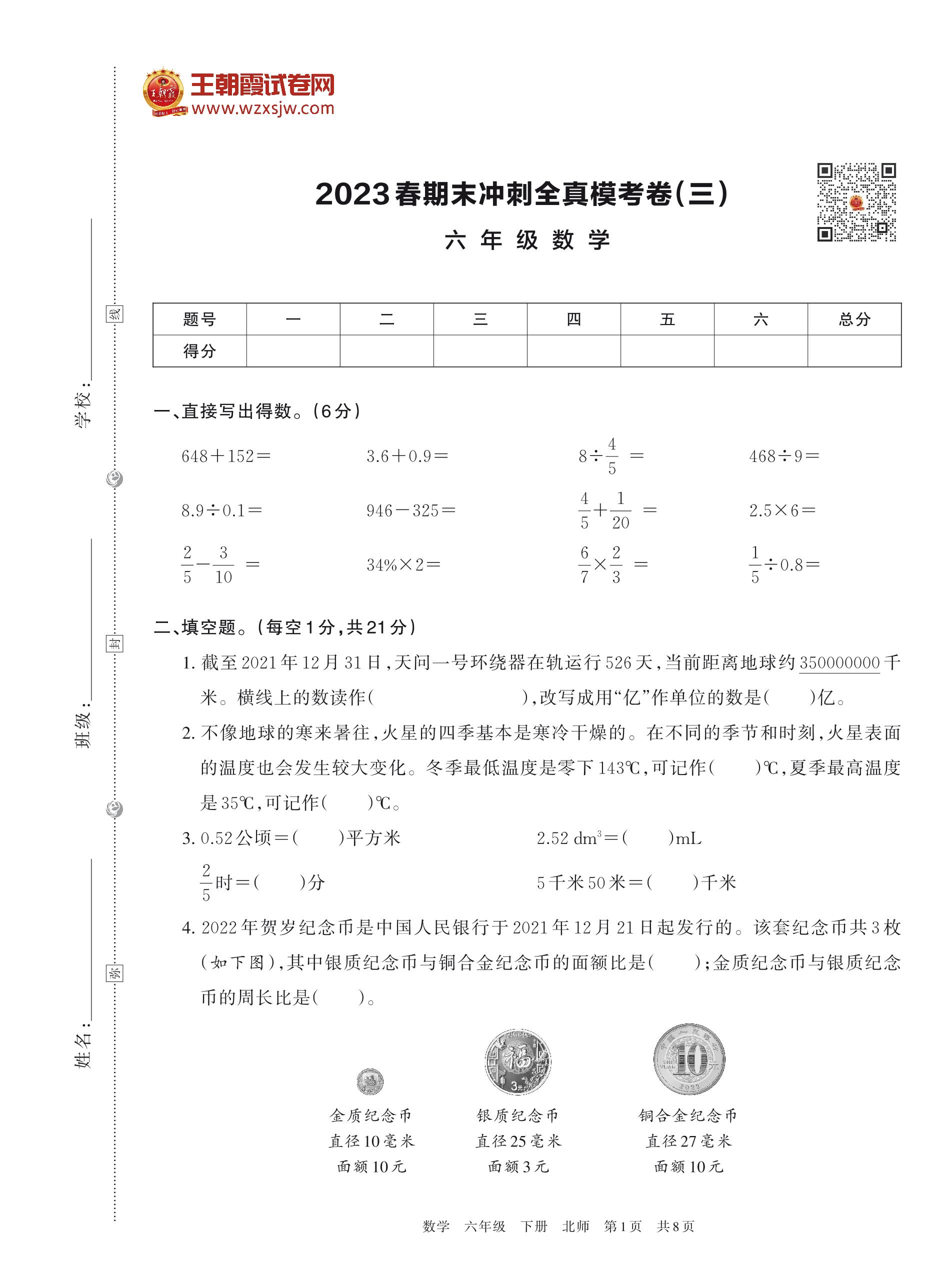 2023春期末冲刺全真模考卷(三)六年级数学(北师版)
