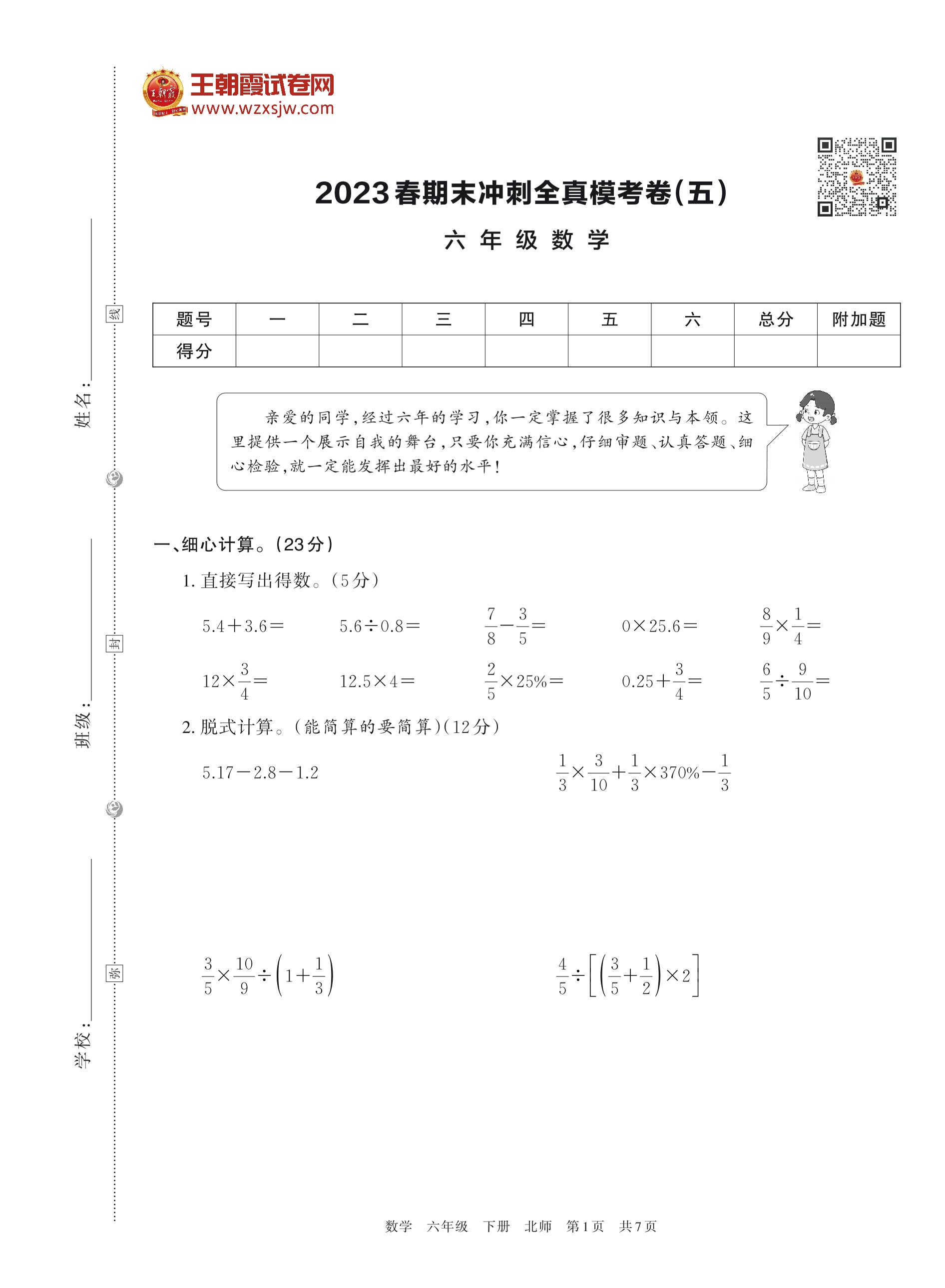 2023春期末冲刺全真模考卷(五)六年级数学(北师版)