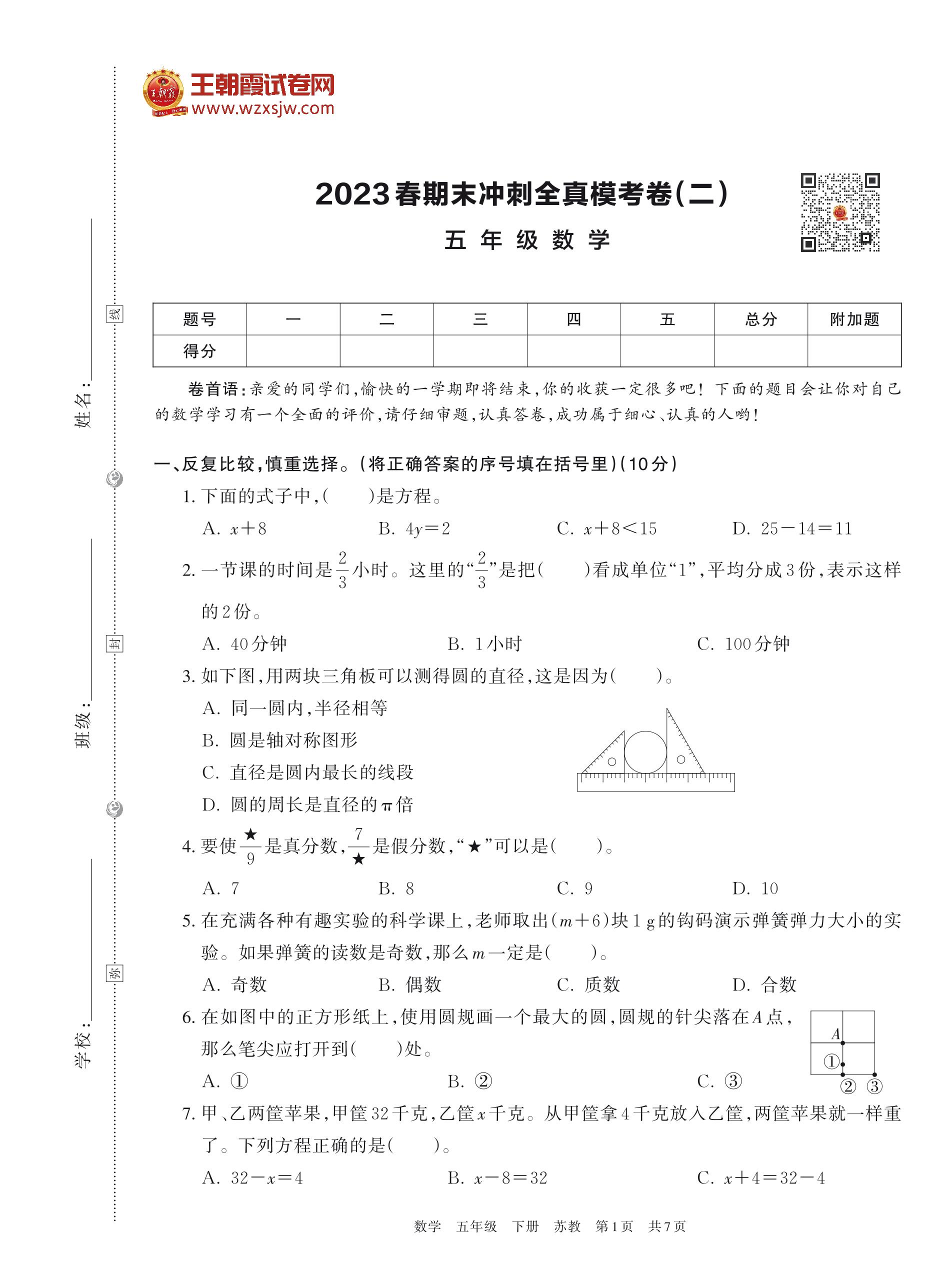 2023春期末冲刺全真模考卷(二)五年级数学(苏教版)