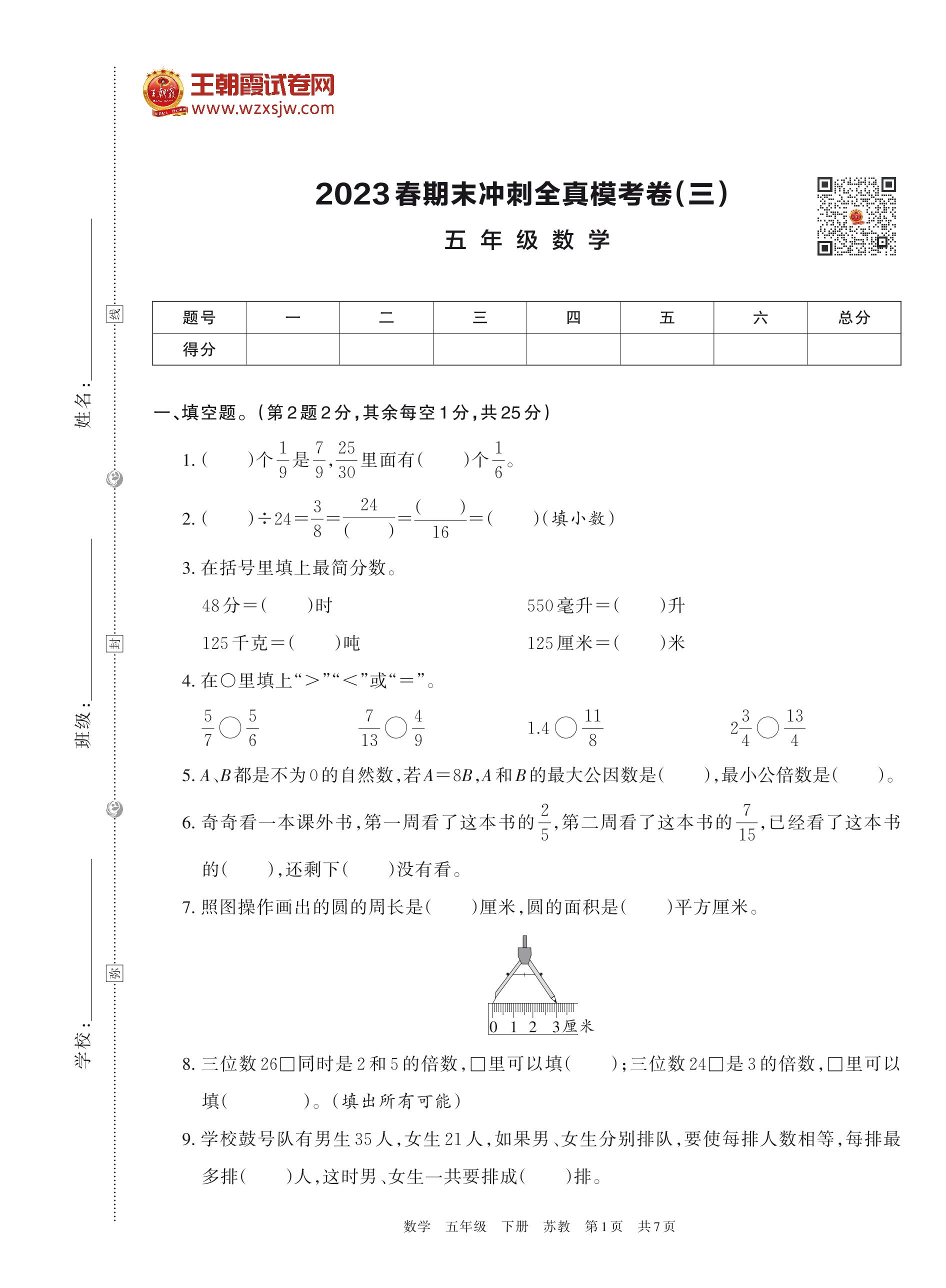 2023春期末冲刺全真模考卷(三)五年级数学(苏教版)