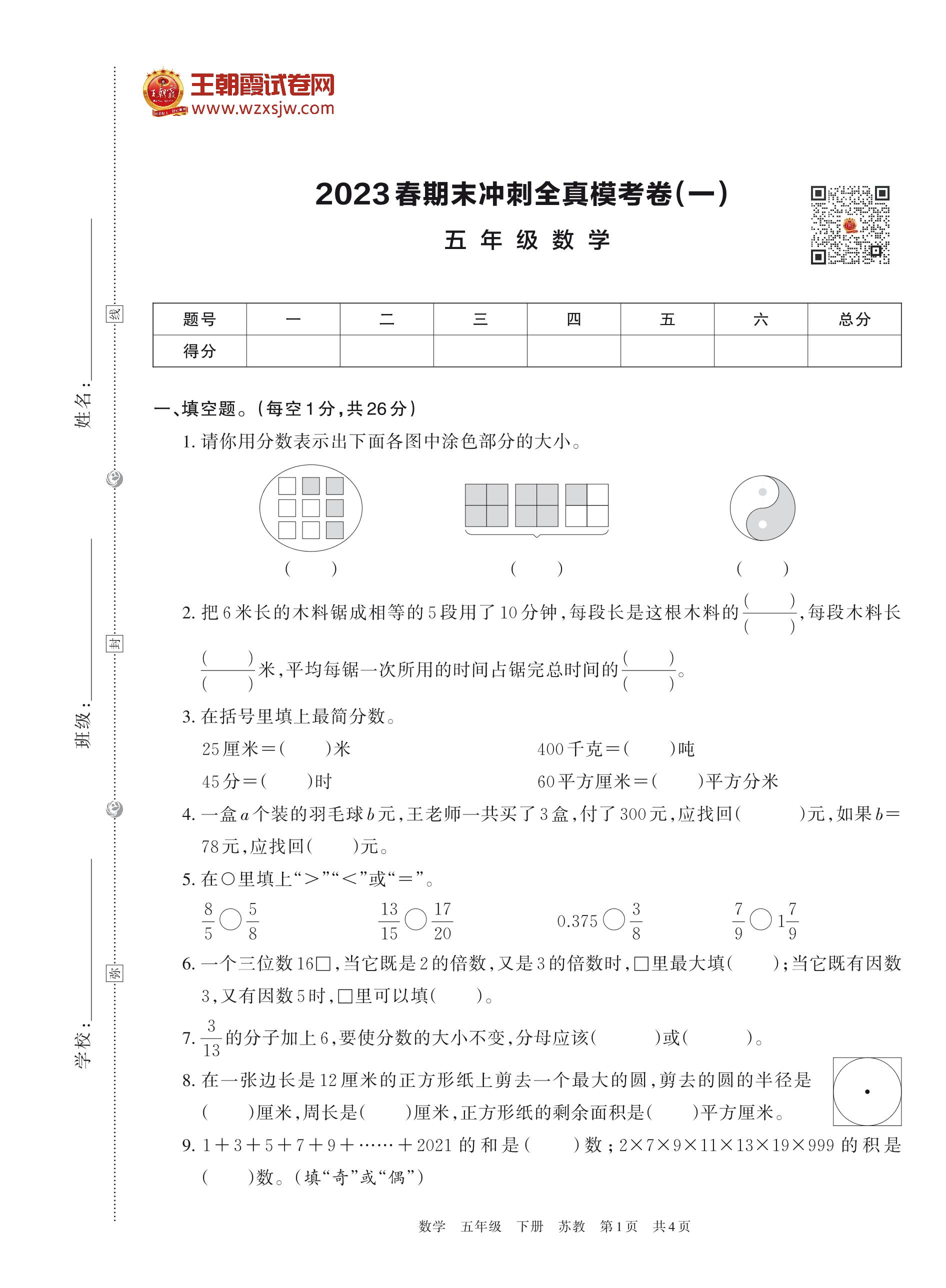 2023春期末冲刺全真模考卷(一)五年级数学(苏教版)