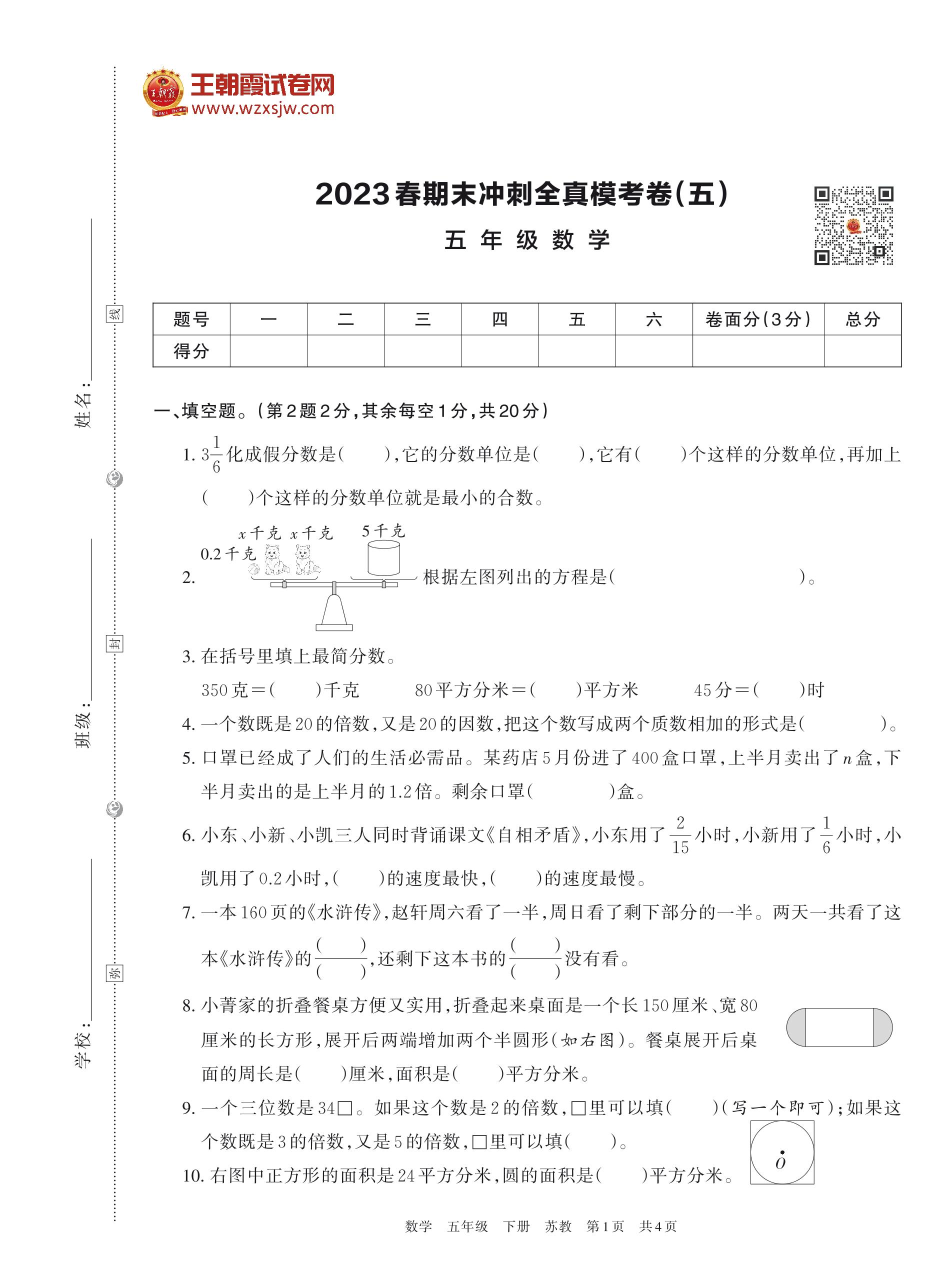2023春期末冲刺全真模考卷(五)五年级数学(苏教版)