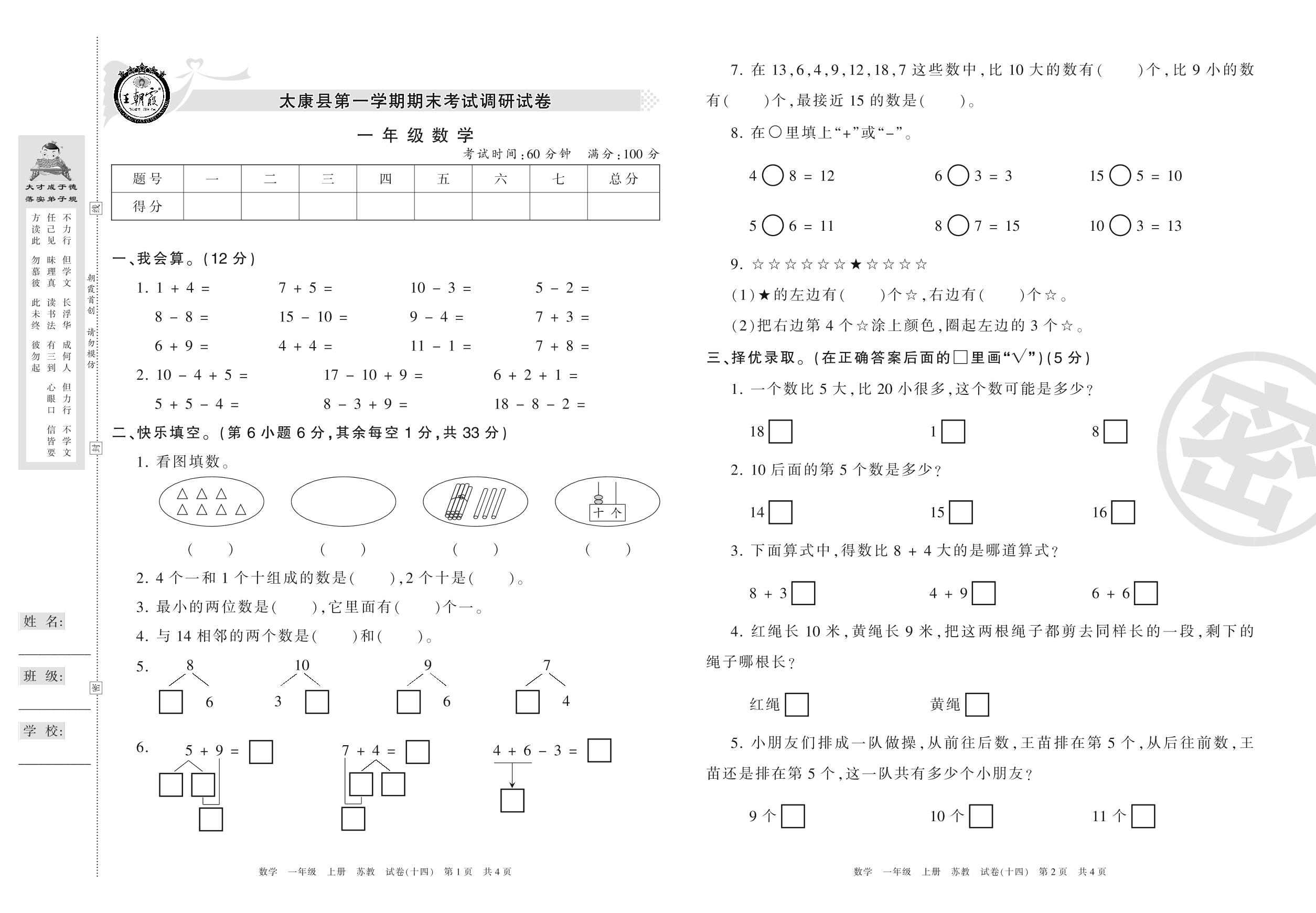 一年级数学苏教版上册期末卷