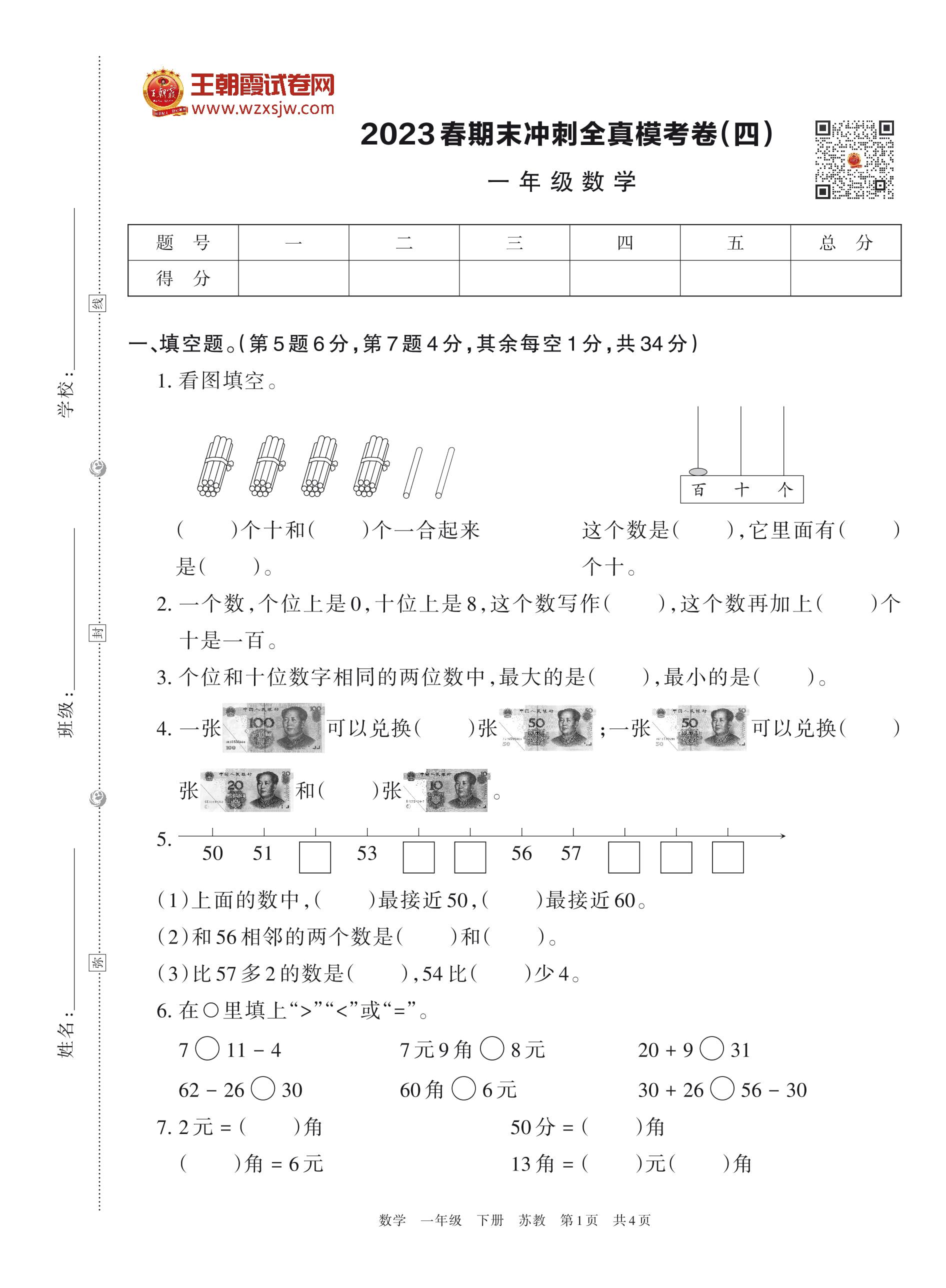2023春期末冲刺全真模考卷(四)一年级数学(苏教版)