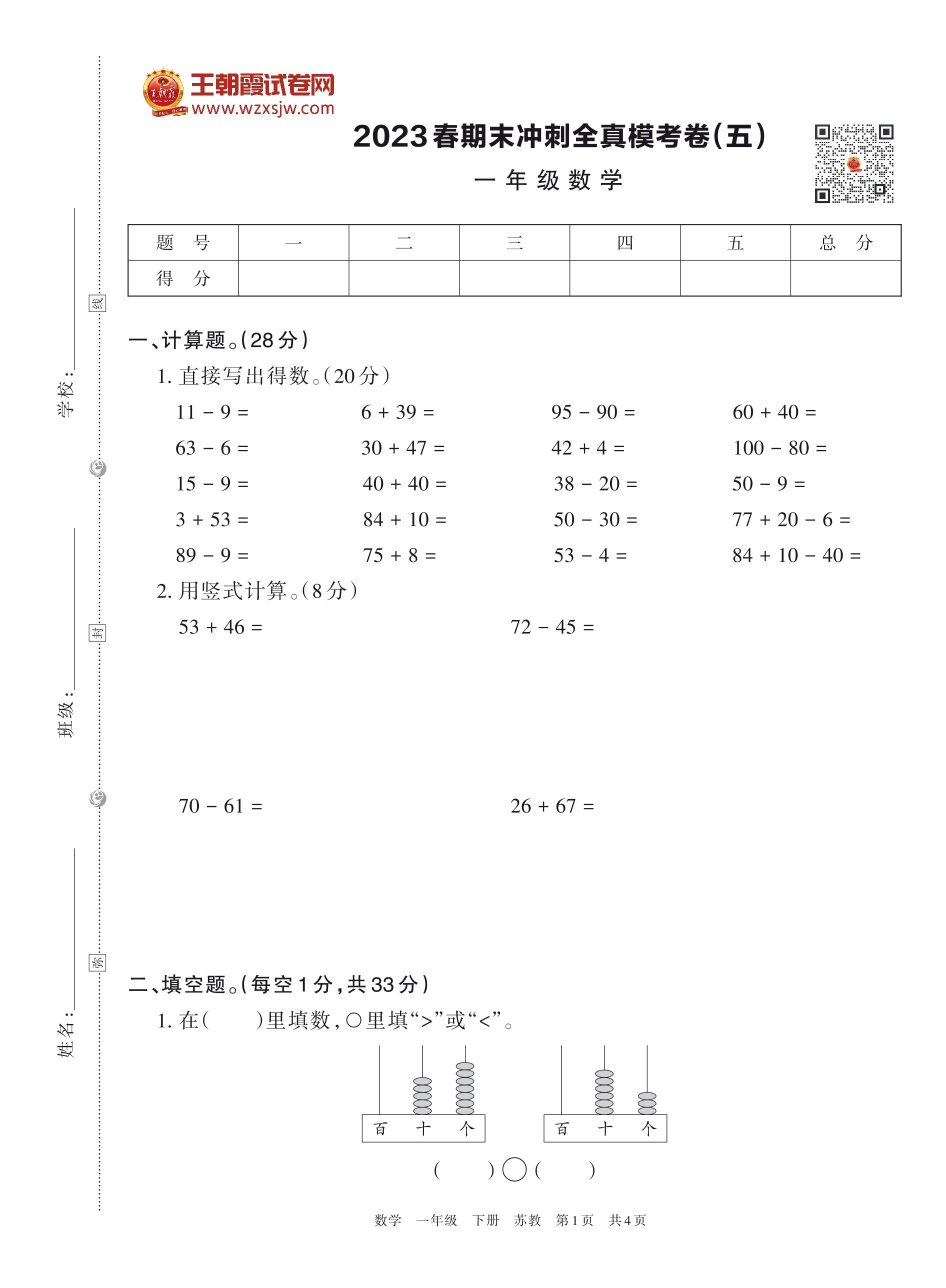 2023春期末冲刺全真模考卷(五)一年级数学(苏教版)