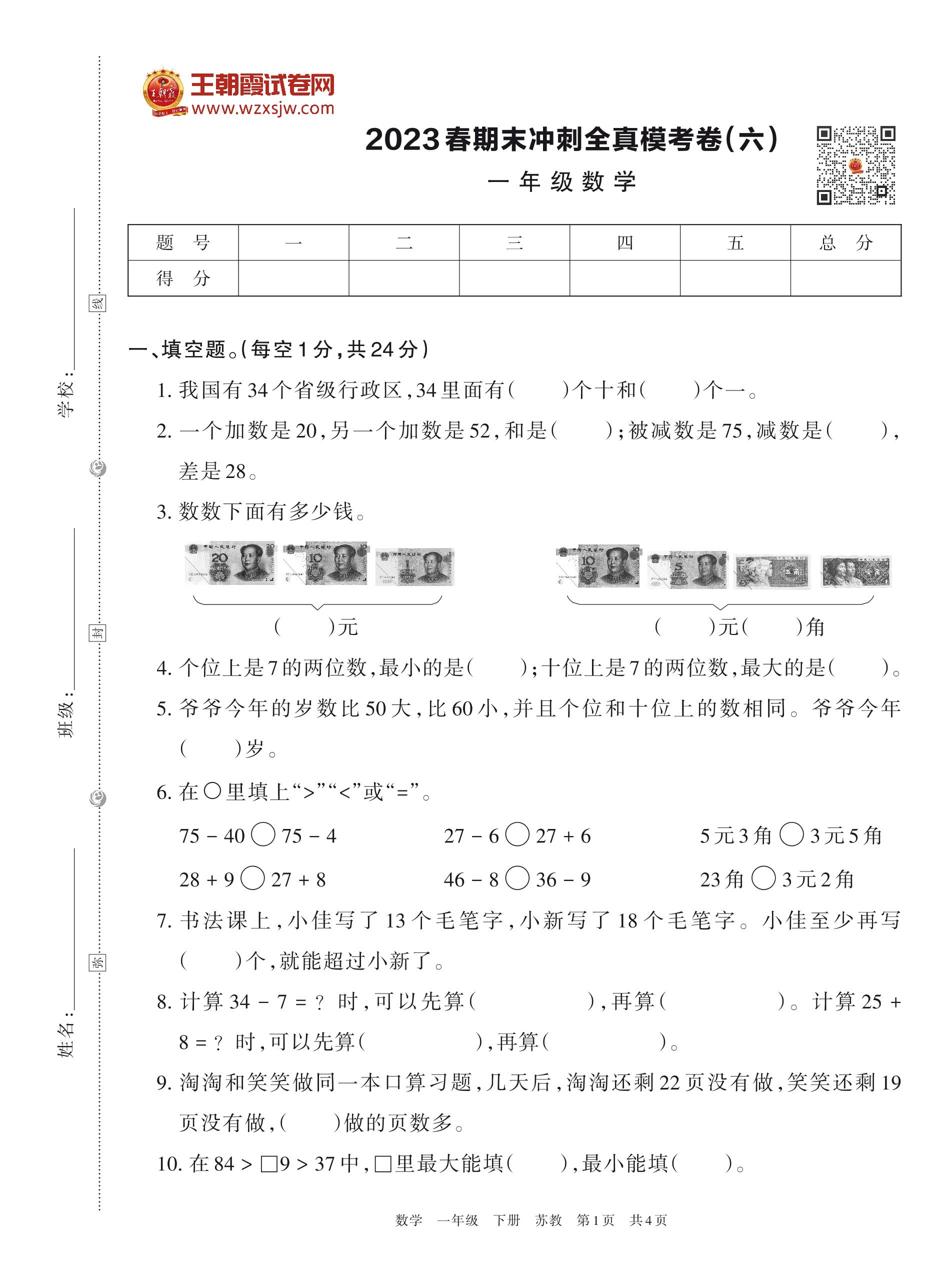 2023春期末冲刺全真模考卷(六)一年级数学(苏教版)