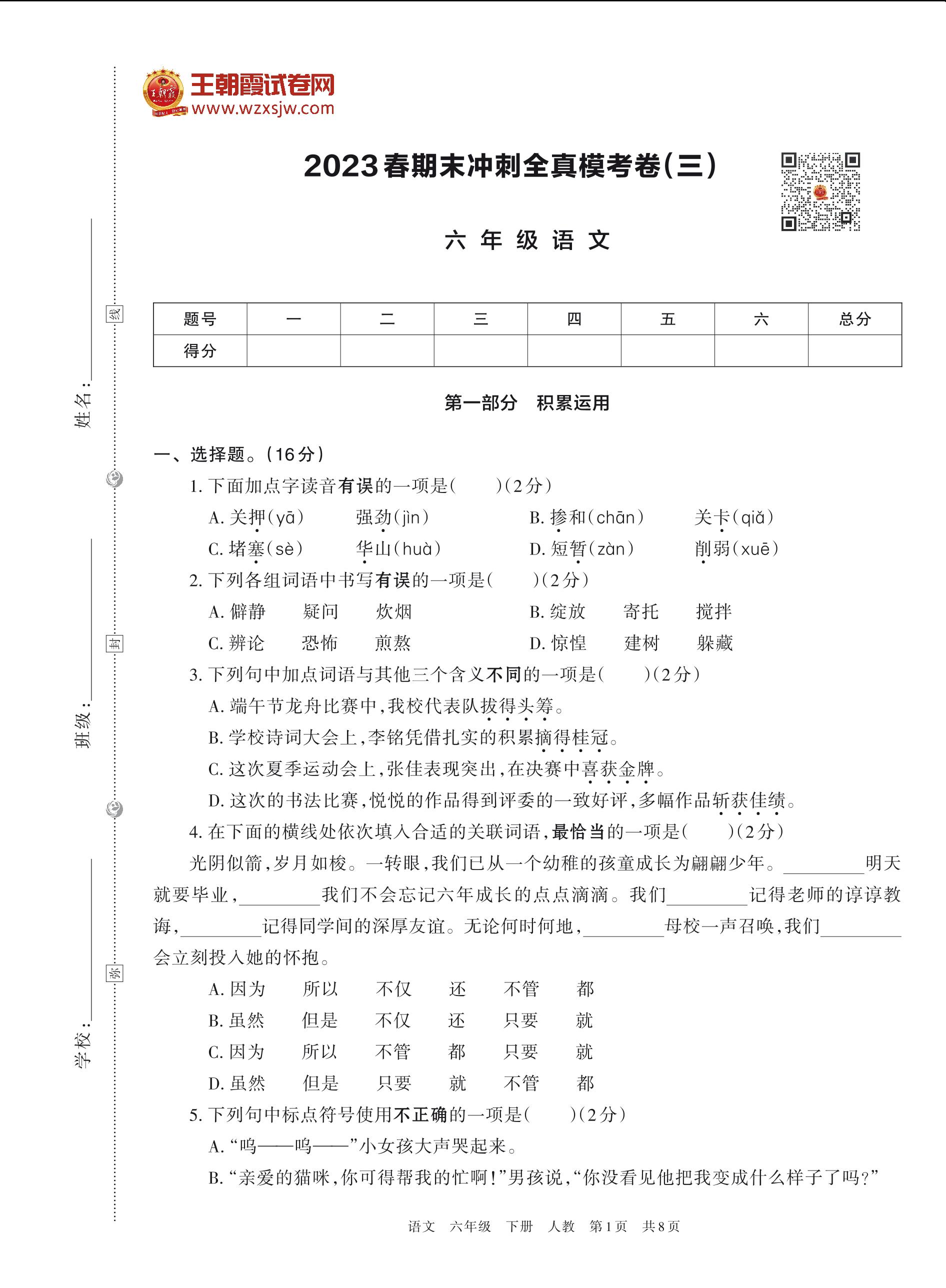 2023春期末冲刺全真模考卷(三)六年级语文(人教版)