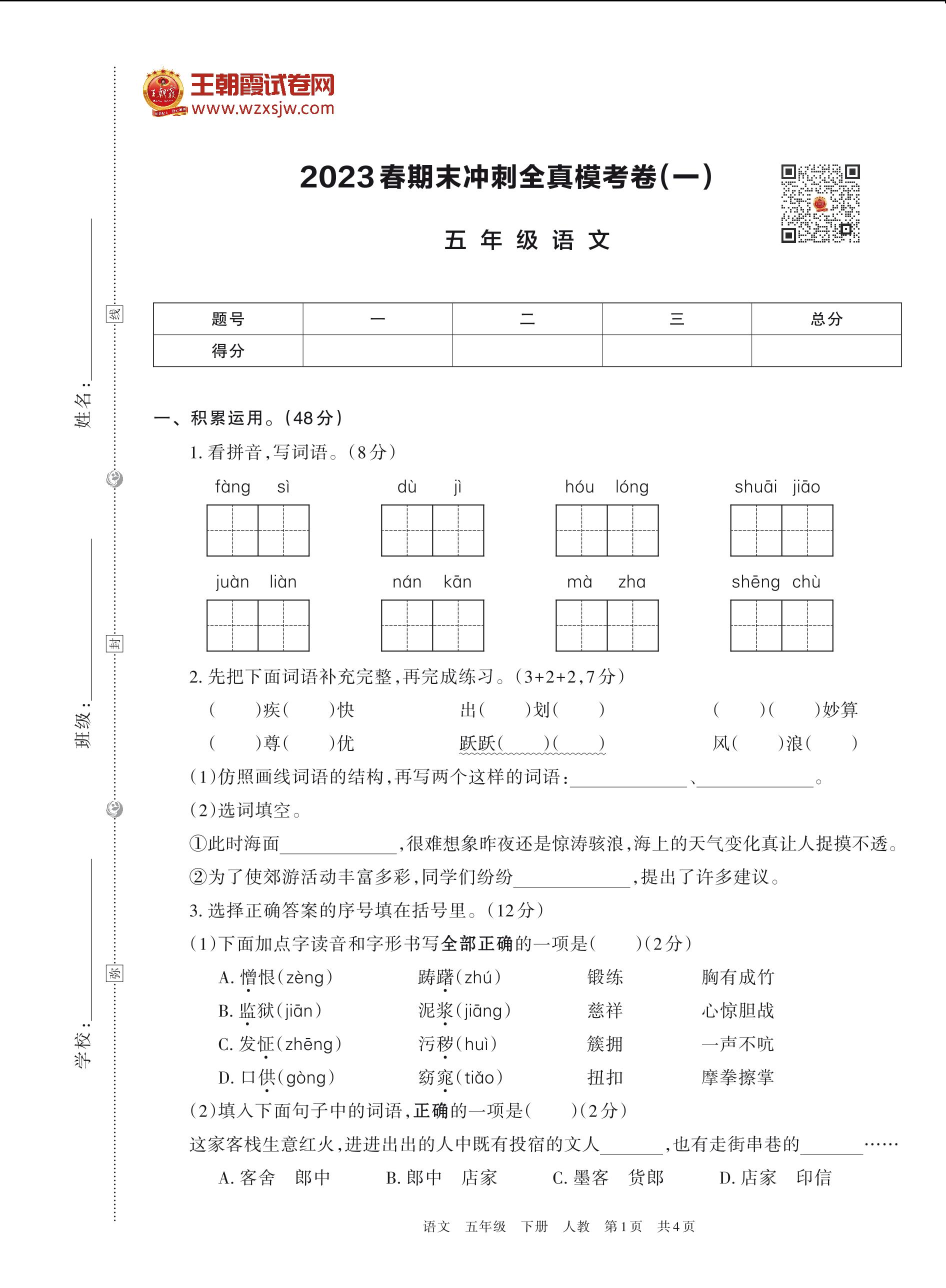 2023春期末冲刺全真模考卷(一)五年级语文(人教版)