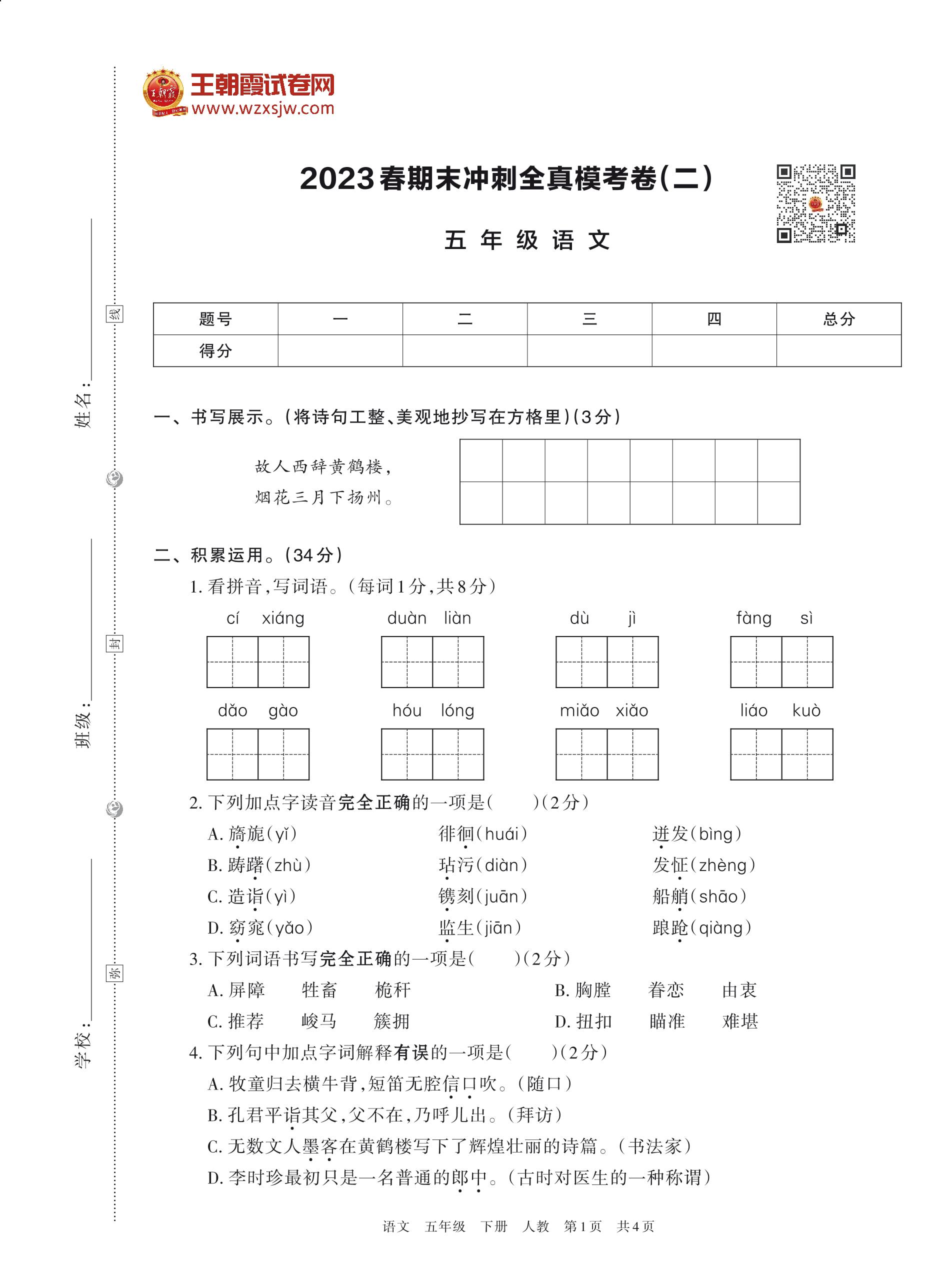 2023春期末冲刺全真模考卷(二)五年级语文(人教版)