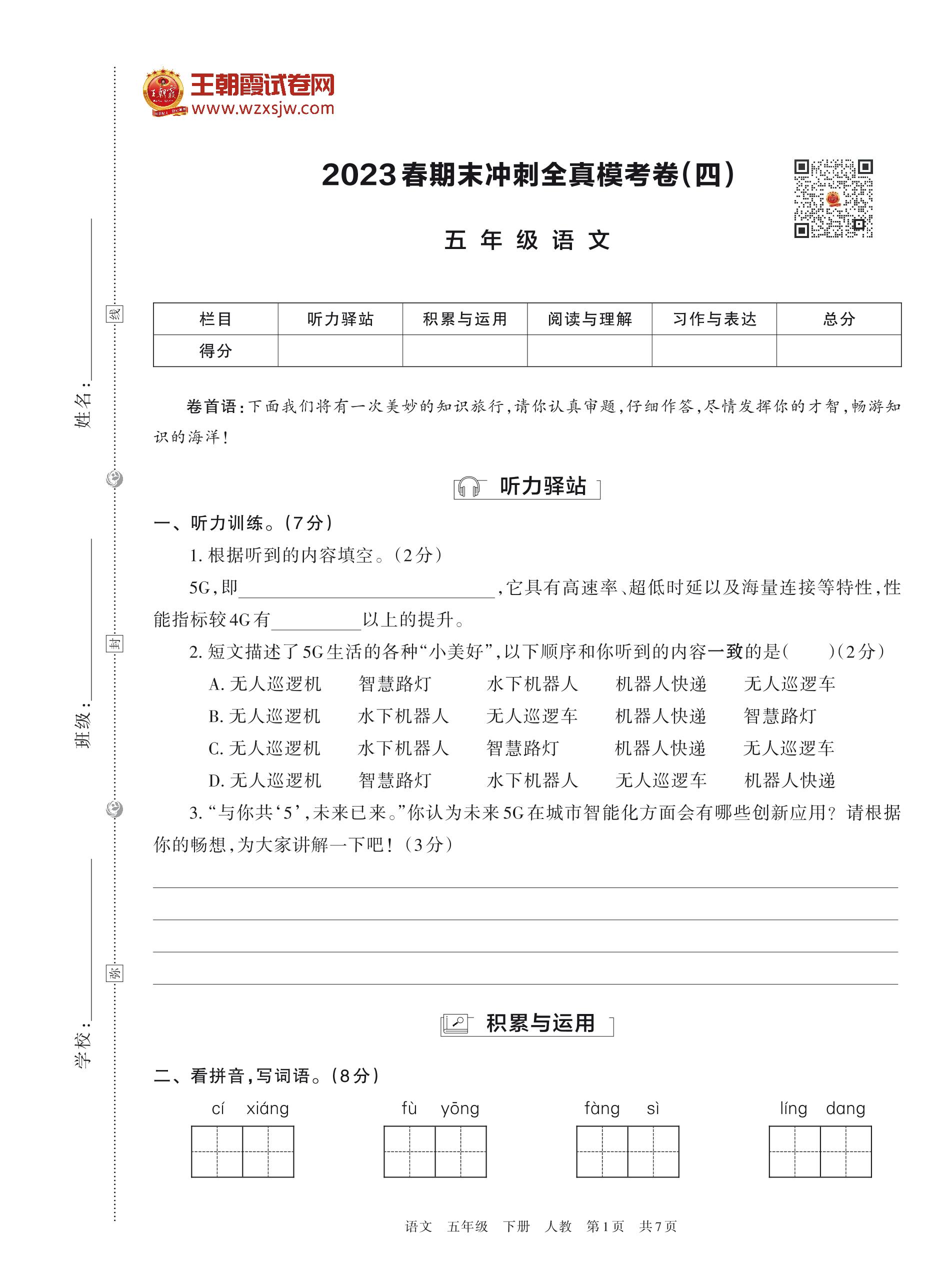2023春期末冲刺全真模考卷(四)五年级语文(人教版)
