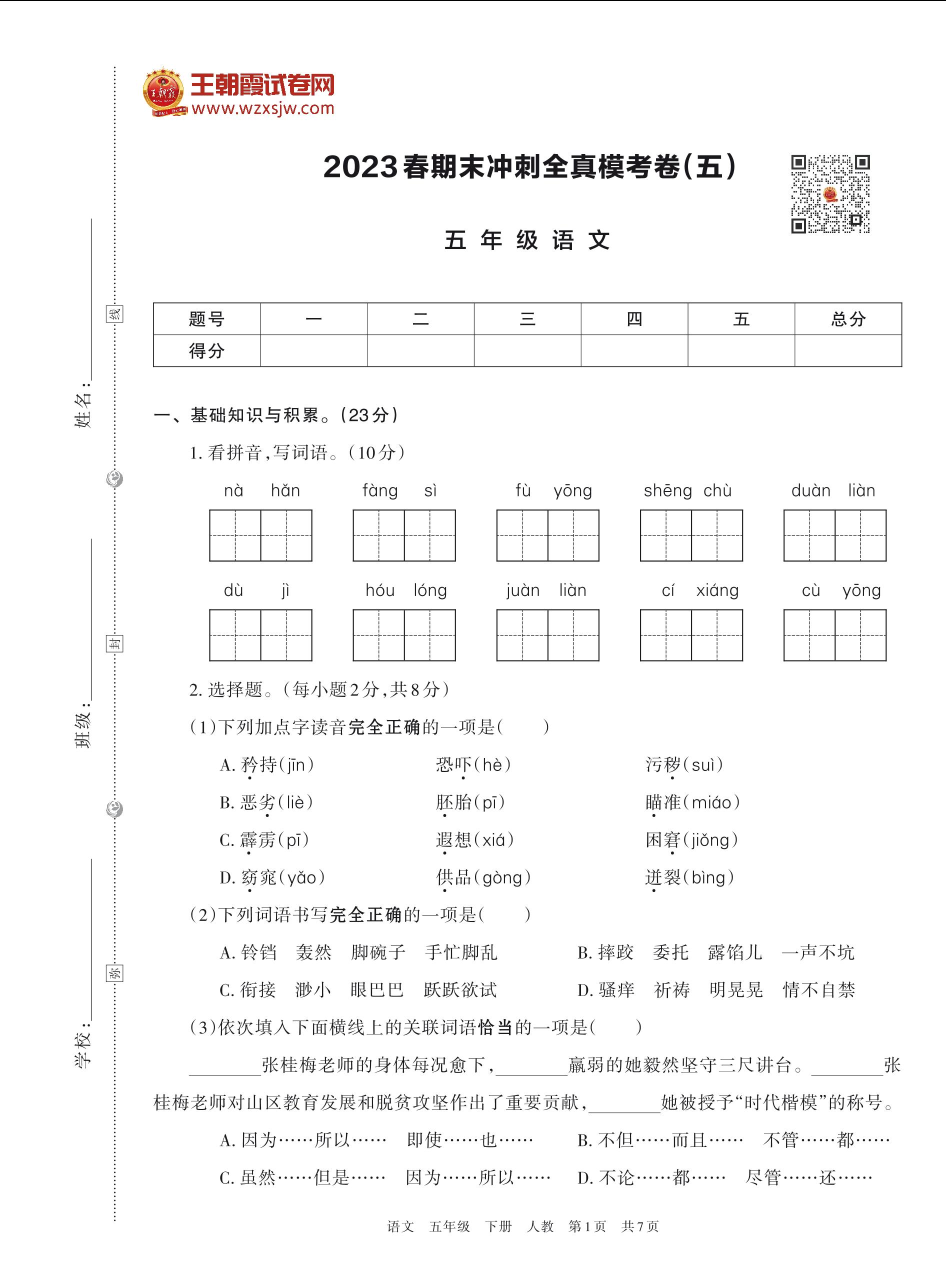 2023春期末冲刺全真模考卷(五)五年级语文(人教版)