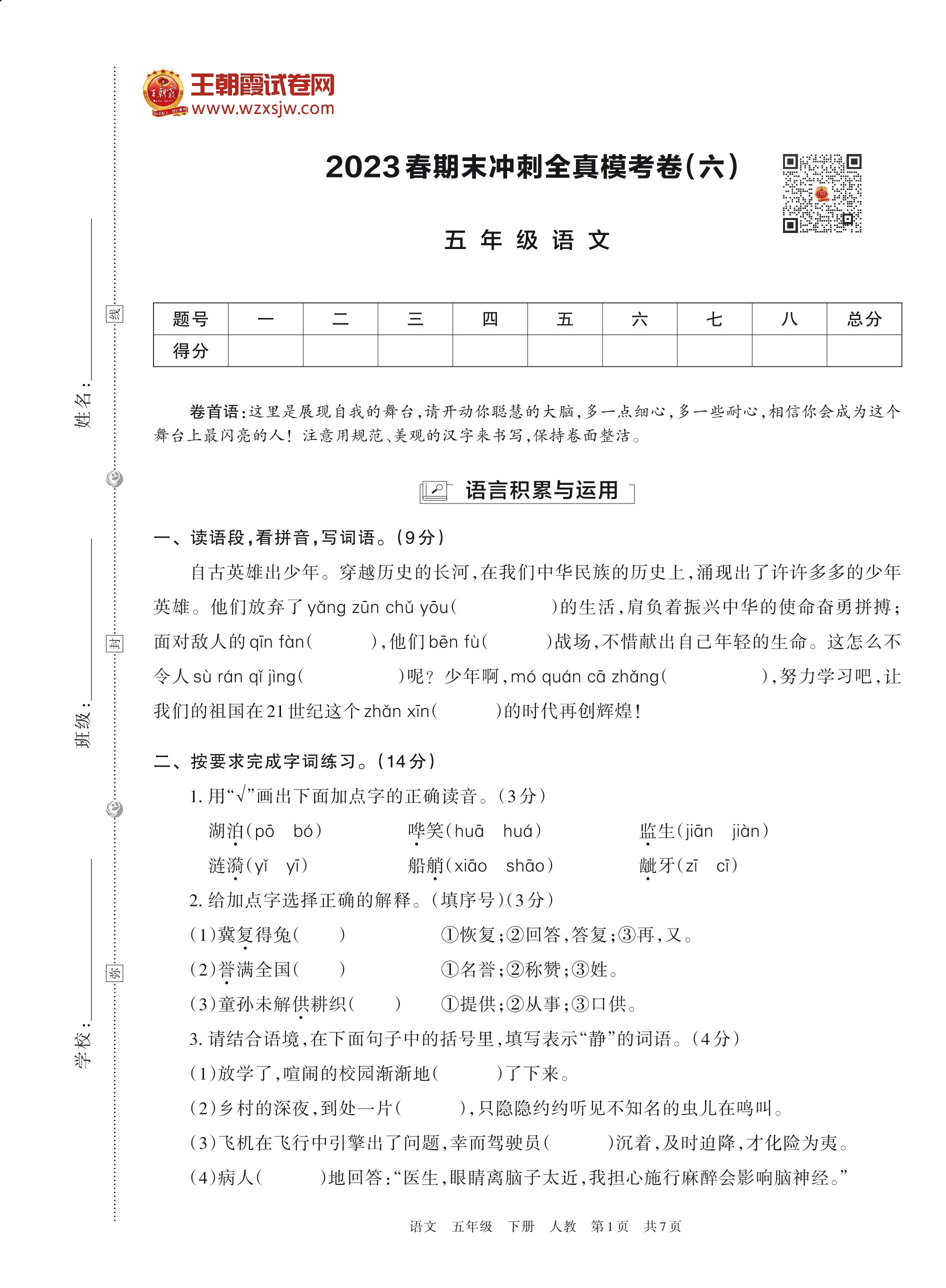 2023春期末冲刺全真模考卷(六)五年级语文(人教版)
