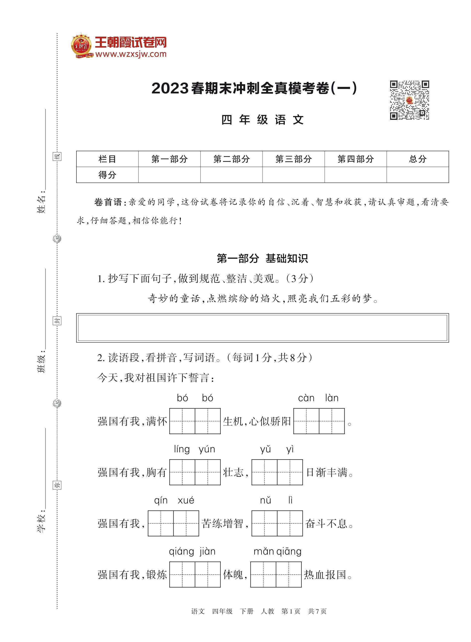 2023春期末冲刺全真模考卷(一)四年级语文(人教版)