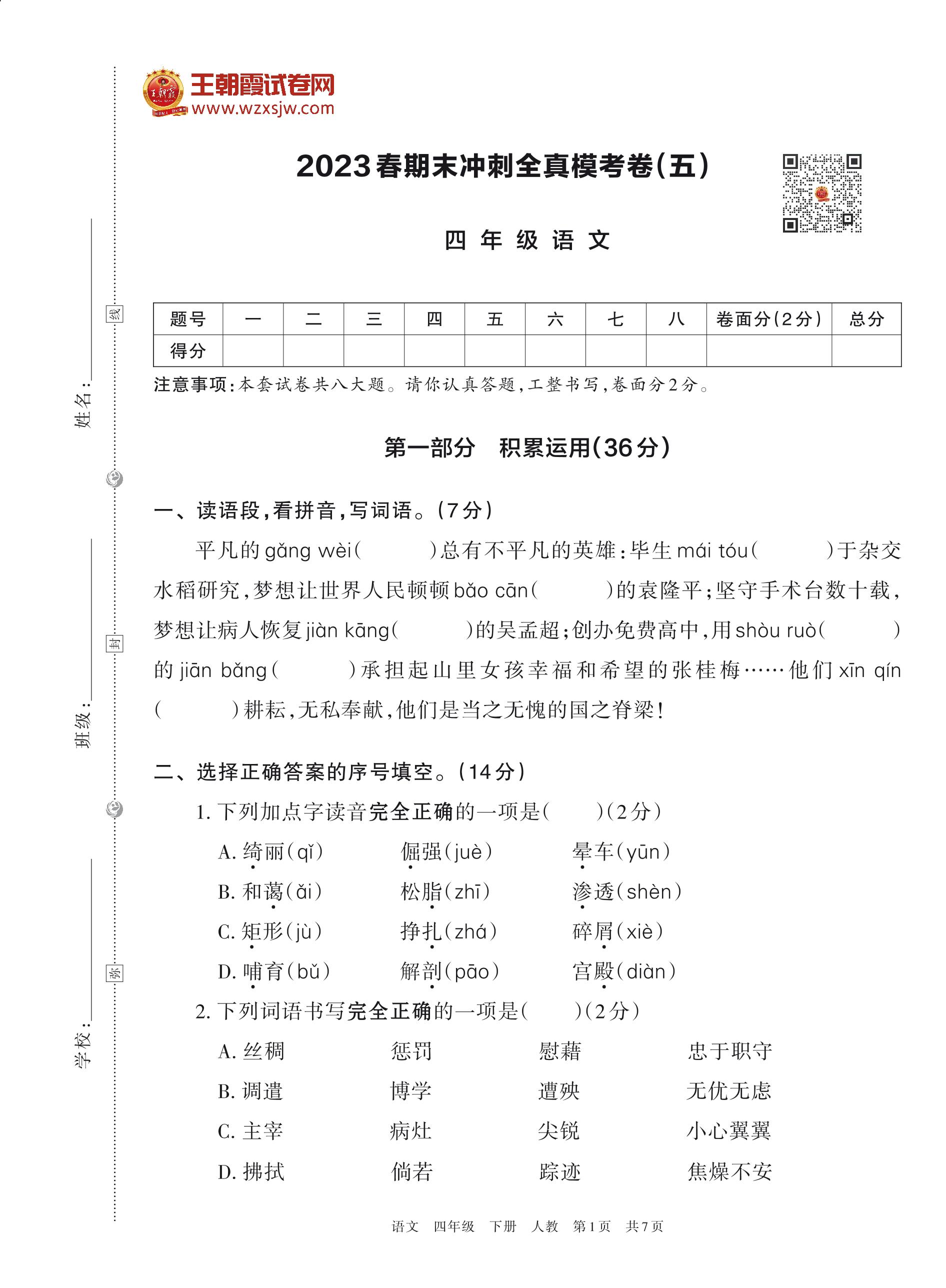 2023春期末冲刺全真模考卷(五)四年级语文(人教版)