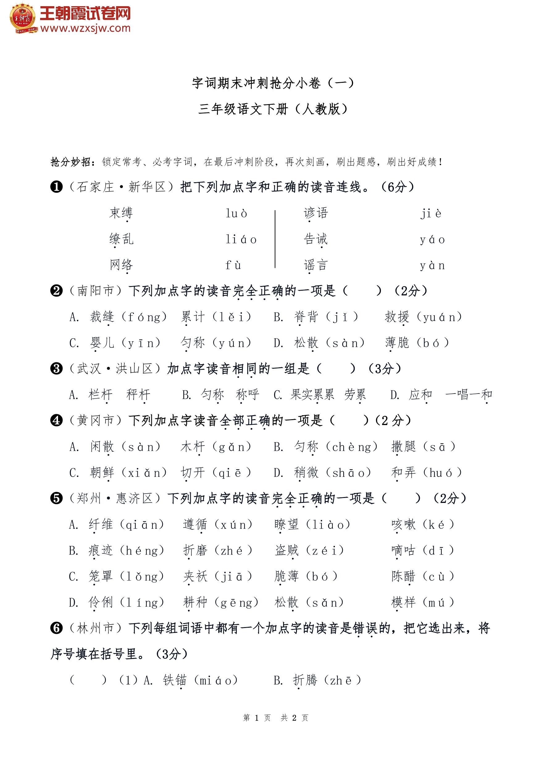 三年级语文下册 字词期末冲刺抢分小卷(一)