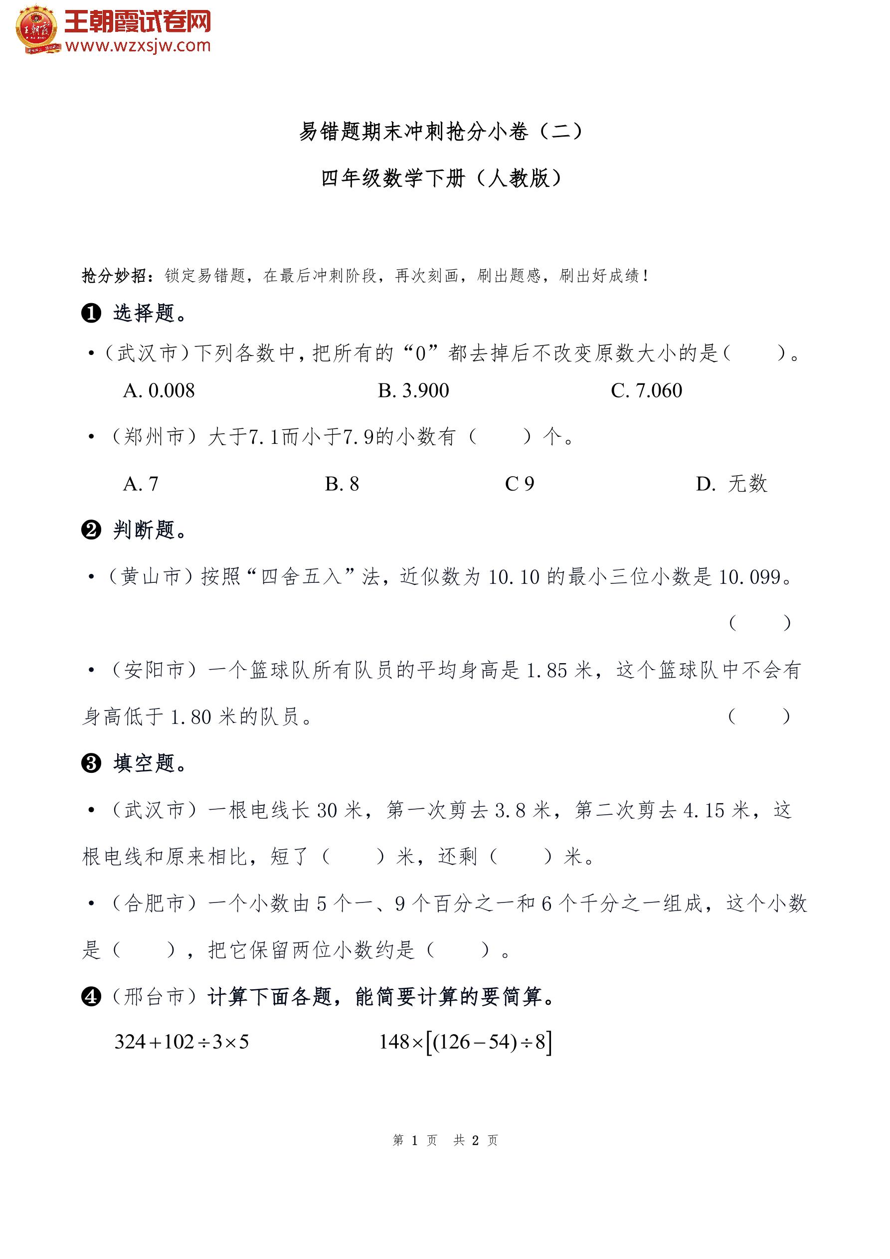 四年级数学下册 易错题期末冲刺抢分小卷(二)