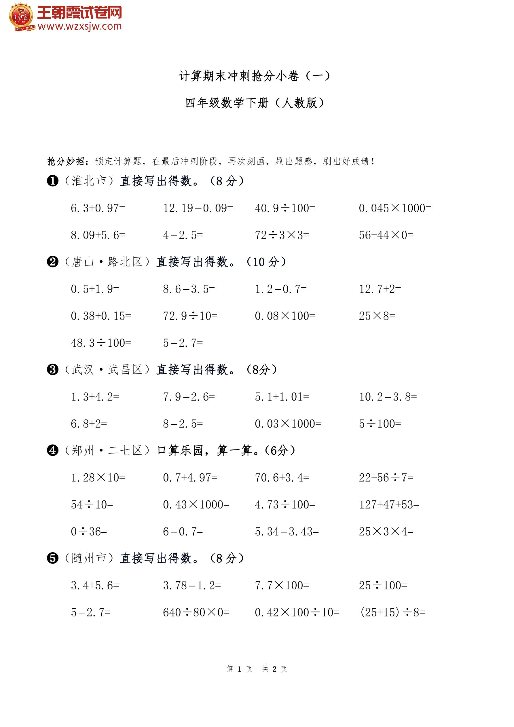 四年级数学下册 计算期末冲刺抢分小卷(一)