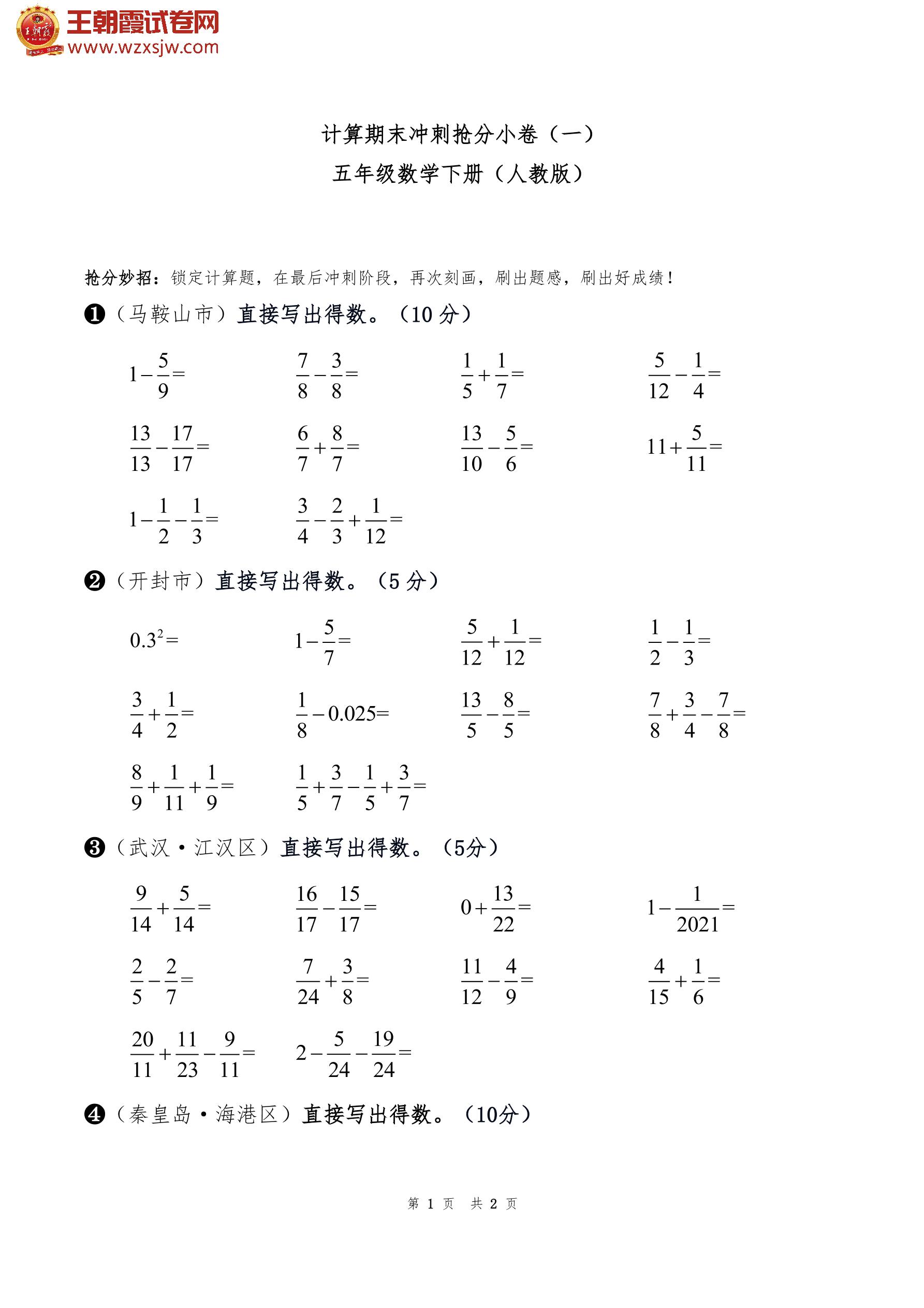 五年级数学下册 计算期末冲刺抢分小卷(一)
