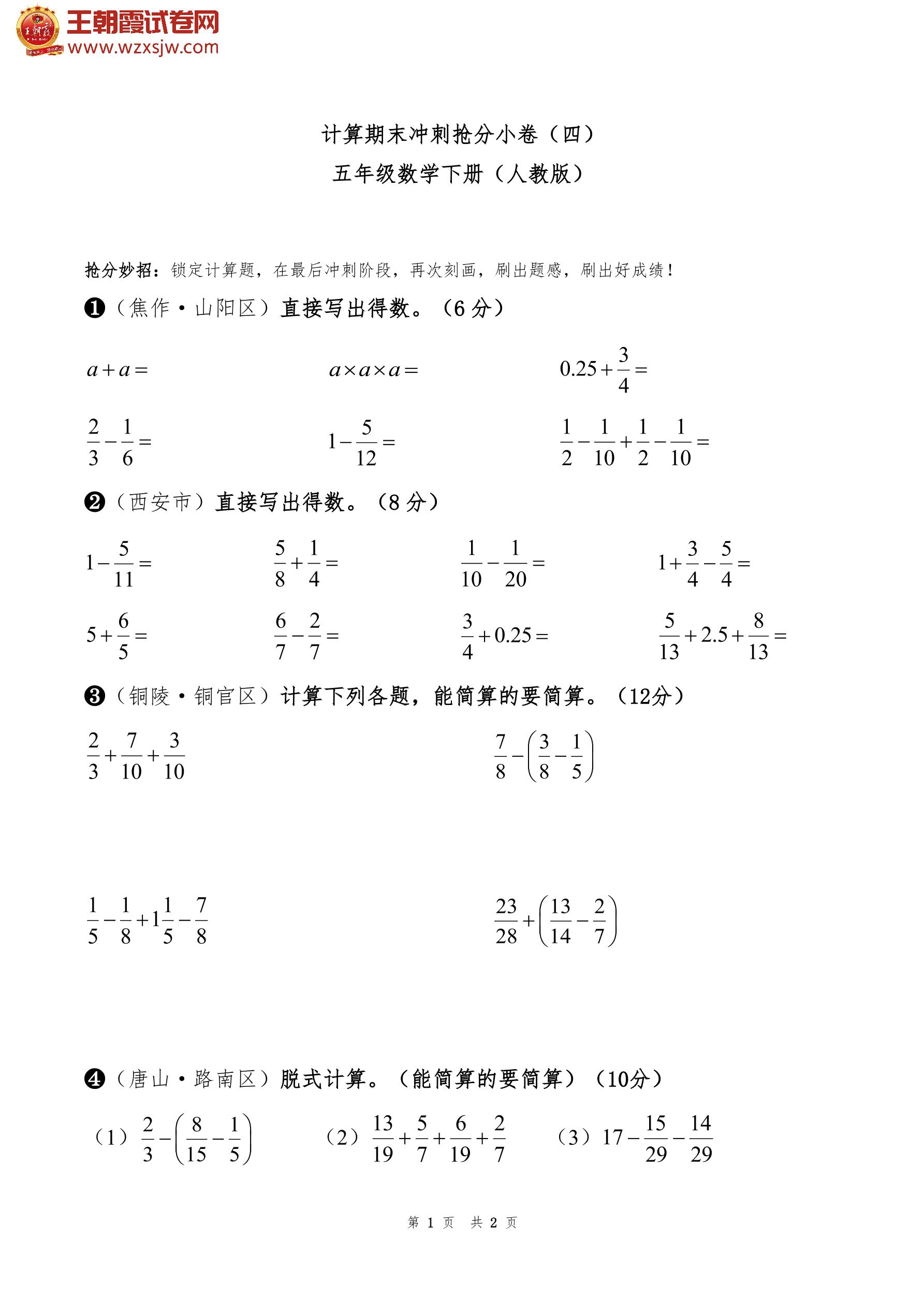 五年级数学下册 计算期末冲刺抢分小卷(四)