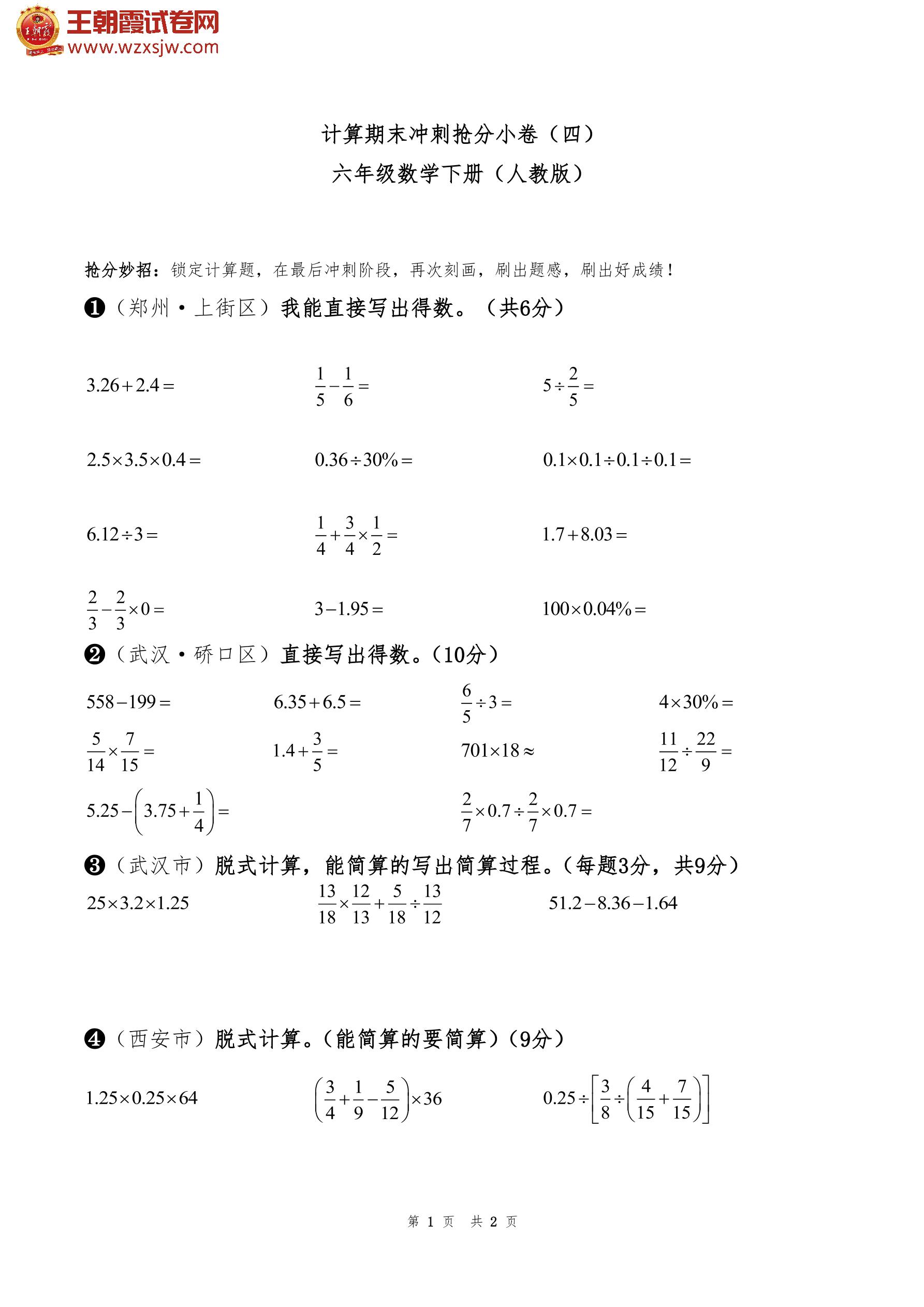 六年级数学下册 计算期末冲刺抢分小卷(四)