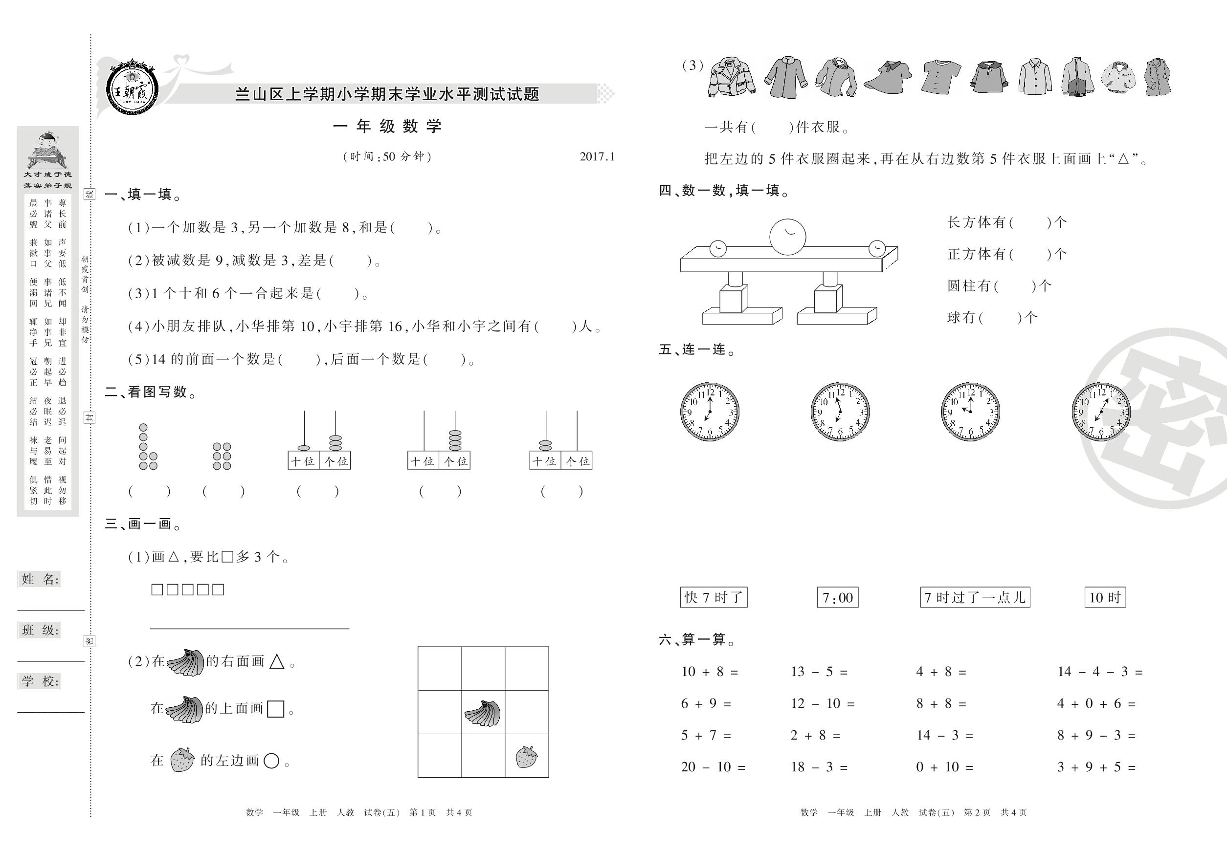 2016-2017学年第一学期临沂市兰山区一年级数学试卷(人教版)【5】